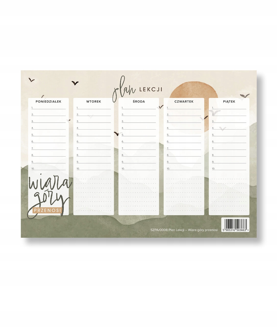 План пропонує місце для заощадження десяти уроків щодня від З понеділка по п’ятницю, що дозволяє детально організувати тиждень. Естетичний дизайн у приглушених кольорах не лише виконує практичну функцію, Але це також прекрасна прикраса будь -якого столу чи стіни. Виберіть це Християнський план уроків, щоб з кожним днем залучати сили з віри, що передає гори.