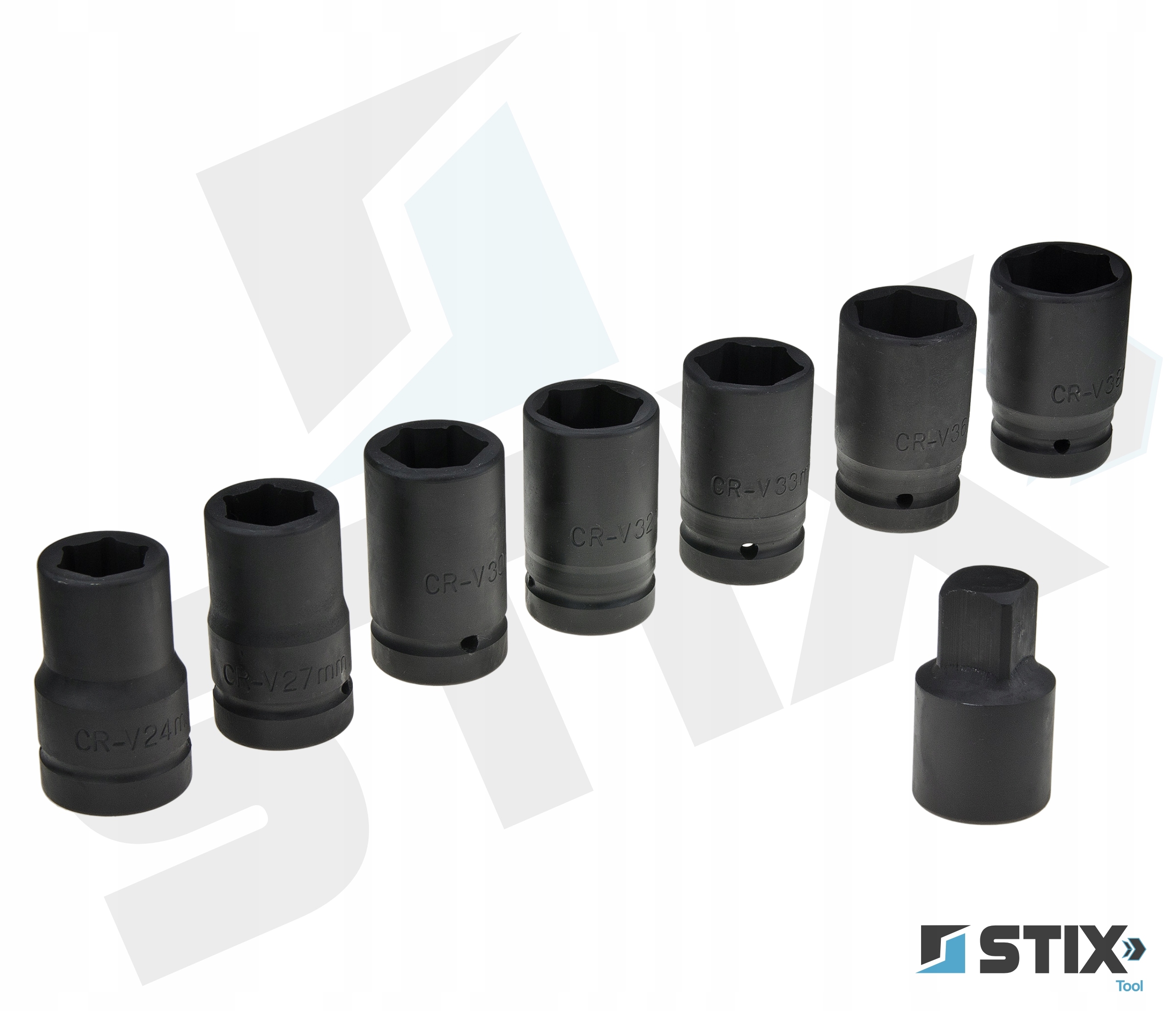 - Набір включає сім головок CrV: 24, 27, 30, 32, 33, 36 і 38 мм.