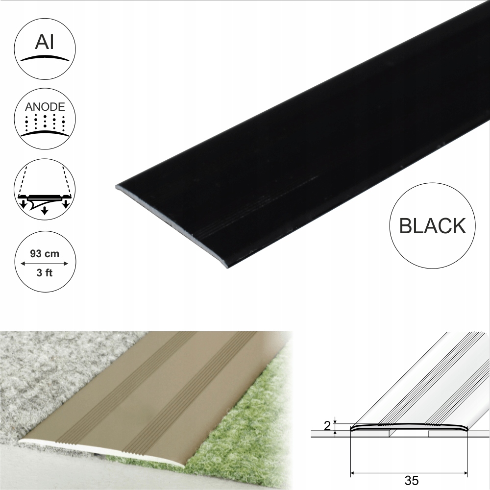 Чорна плоска алюмінієва самоклеюча смуга для підлоги чудової якості. Ідеально підходить для з’єднання дерев’яних, ламінованих, вінілових або плиткових підлог, які знаходяться на одному рівні.