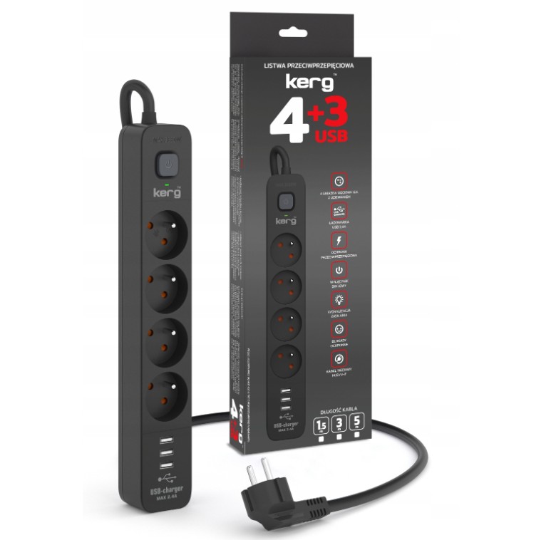 ІНФОРМАЦІЙНИЙ ЗАХИСТНИК ПІДДОВЖУВАЧ 4 РОЗЕТКИ 3x КАБЕЛЬ-ПОДОВЖУВАЧ USB Kerg