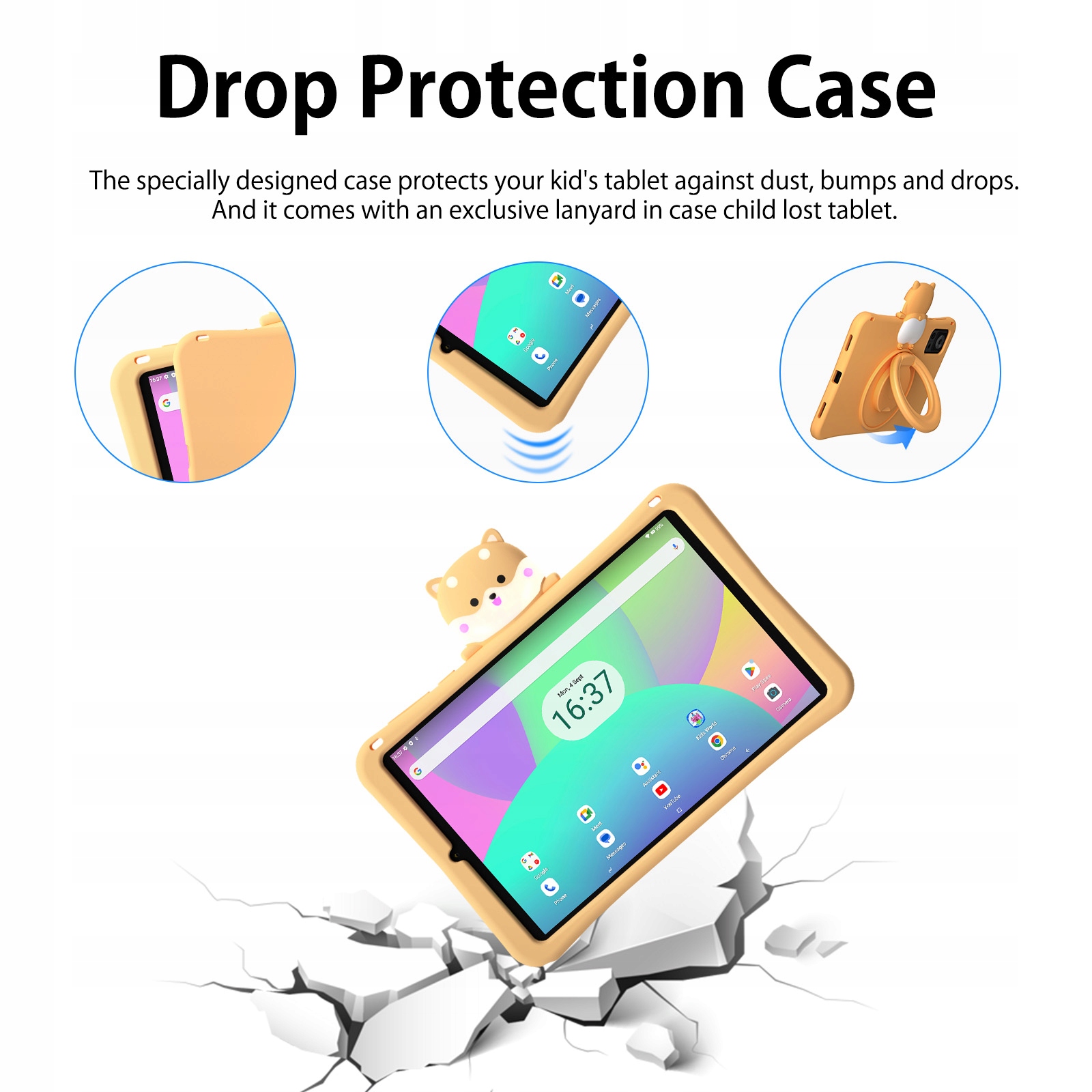 Міні-планшет DOOGEE T20 для дітей. Ергономічна переносна ручка ідеально поміщається в маленькі дитячі ручки. На задній частині дитячого планшета розташована регульована підставка, яку легко відрегулювати під будь-яким кутом. Дитячий планшет поставляється зі знімним дитячим силіконовим чохлом, який запобігає стабілізації та падінню планшета (також можна використовувати як звичайний планшет).