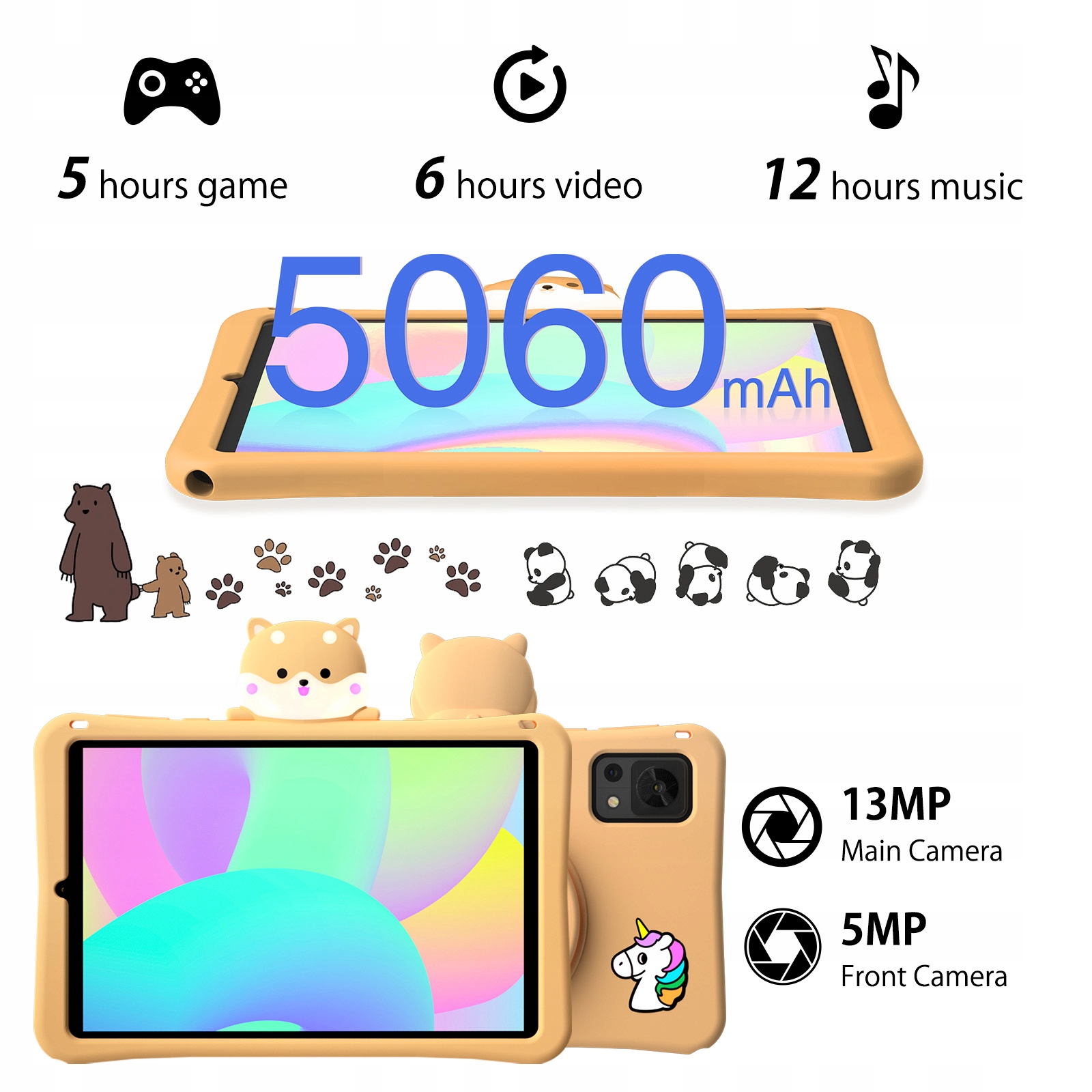 - Дитячий планшет із основною камерою 13 МП і фронтальною камерою 5 МП дає дітям чіткі та яскраві фотографії. Основна камера фіксує деталі та прекрасні моменти; фронтальна камера підходить для живих селфі та відеодзвінків. Ця комбінація не тільки задовольняє дитяче захоплення фотографією, але й сприяє створенню та обміну унікальним вмістом у цифровому світі, підтримуючи творчість і самовираження