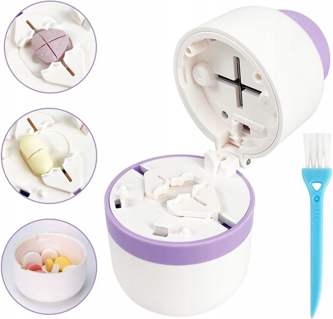 Матеріал Leishouer Цей різак для таблеток виготовлено з АБС-пластику та нержавіючої сталі, що означає, що цей маленький пристрій безпечний і довговічний. Використання Використовувати форму для таблеток просто. Спочатку переконайтеся, що ваші руки чисті та сухі. Потім помістіть планшет у центральне положення та поверніть зовнішнє кільце, щоб зафіксувати положення. Нарешті натисніть на різак для таблеток і сильно та швидко вдарте по ньому, щоб розділити таблетку на дві або чотири частини. Наш великий розгалужувач планшетів також має великий простір для зберігання, який може вмістити 2030 планшетів, що еквівалентно футляру для планшета. Легко чистити Натисніть верхню кнопку під час чищення леза та обережно почистіть його щіткою lti. Примітка. Зберігайте форму для таблеток у безпечному місці, подалі від дітей і домашніх тварин.