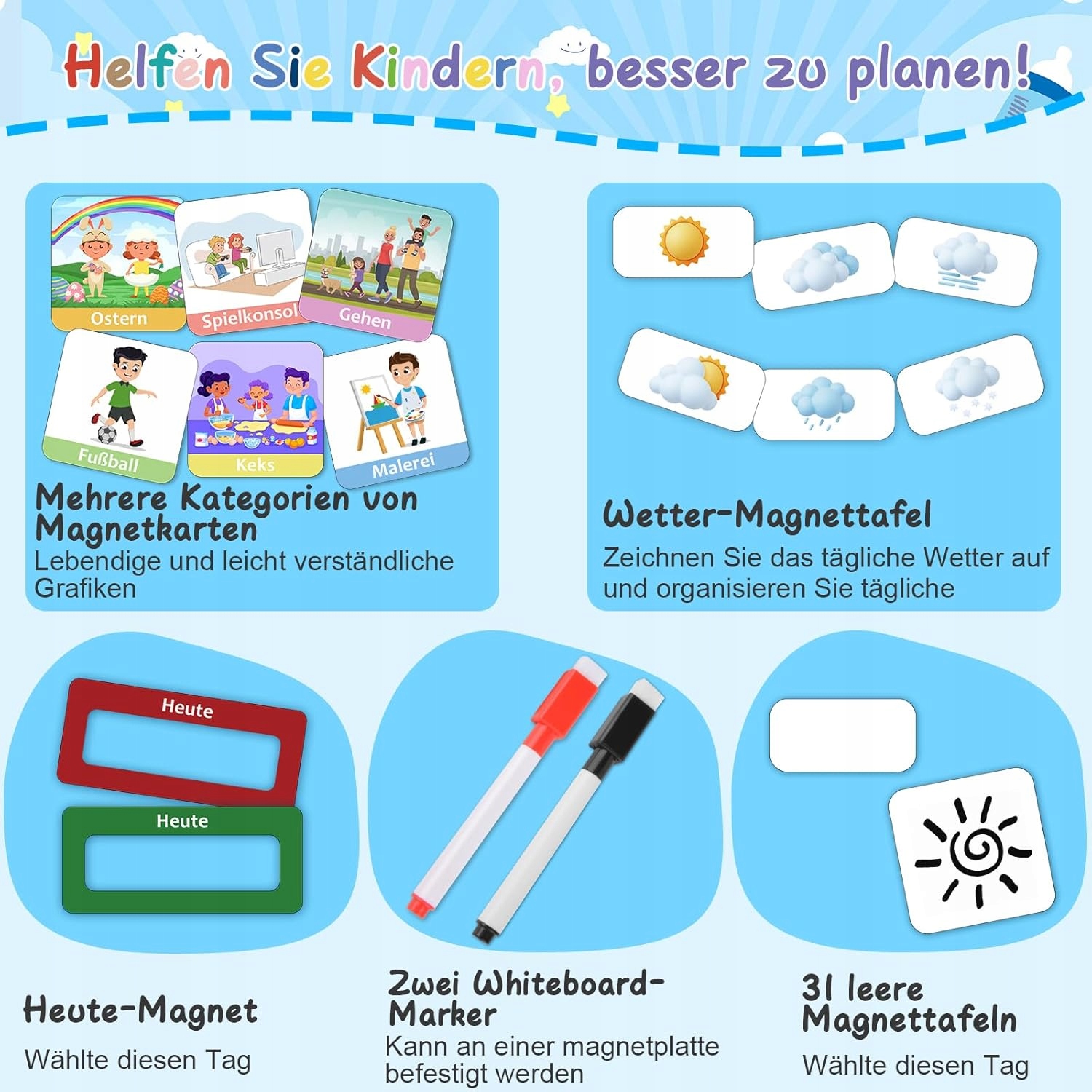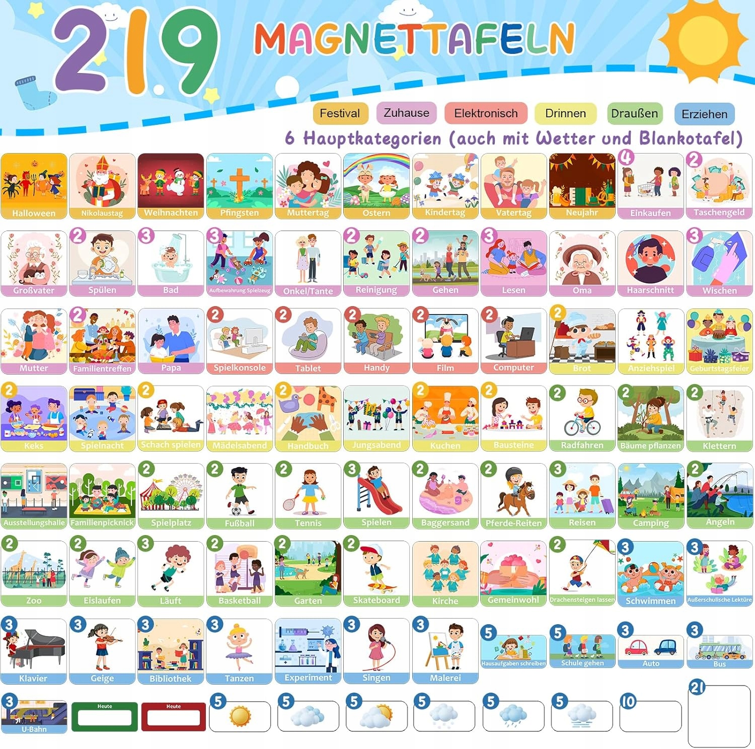 • Чудовий подарунок - магнітний тижневий планувальник ідеально підходить для педагогіки Монтессорі та допомагає дітям краще організувати своє повсякденне життя. Картки містять завдання з малюнками, тому діти можуть легко зрозуміти вміст картки, навіть якщо вони ще не можуть прочитати кожне слово. Красива і практична дитяча дошка для нагород також ідеально підходить як подарунок на день народження, Хелловін і Різдво