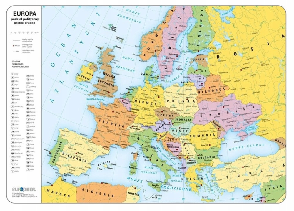 8 сторінок кольорових карт із зображенням Польщі, європейських країн, світу, часових поясів і пилкового календаря