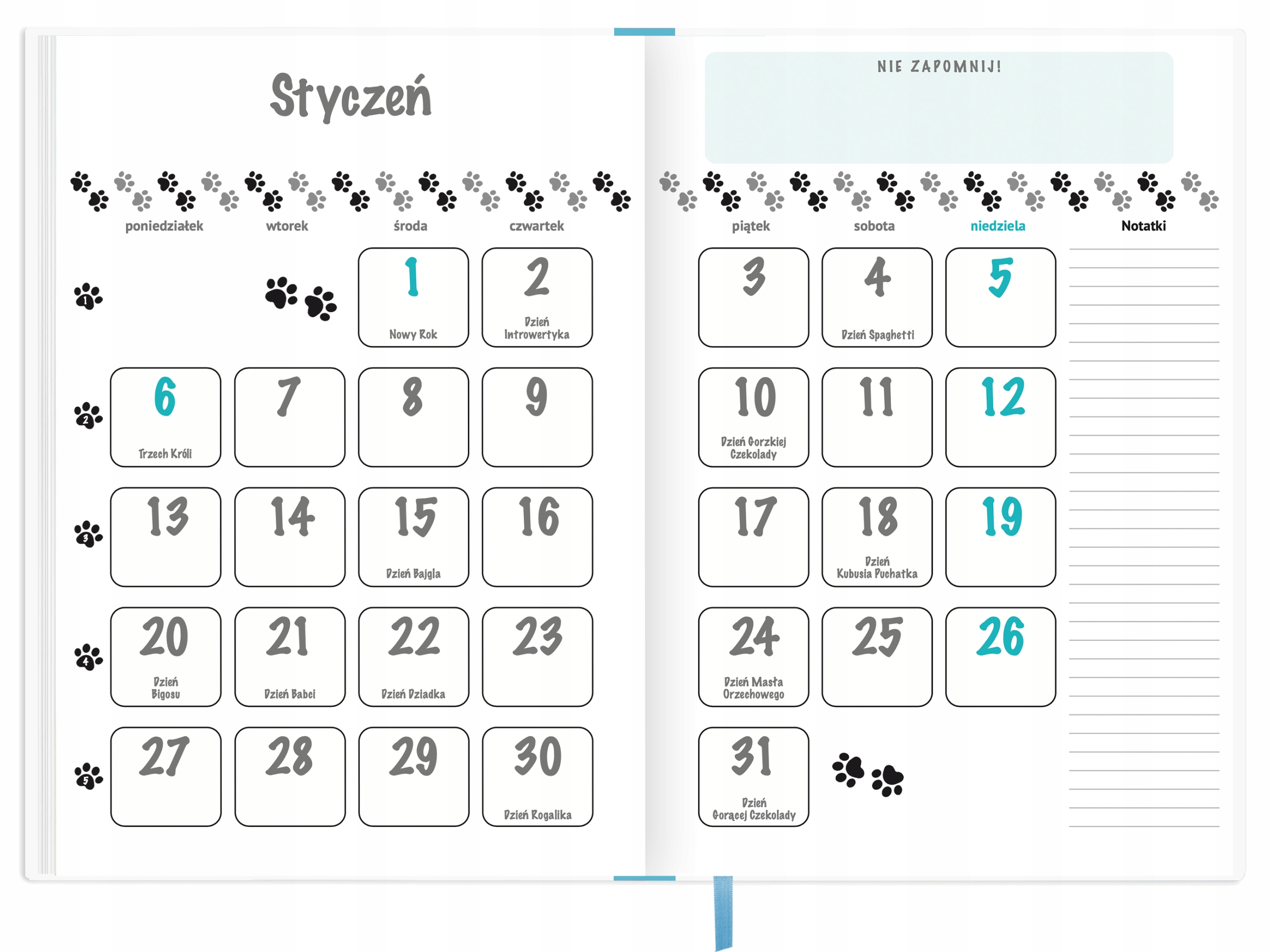 - місце для введення місячних планів (примітки) Календар має атласну стрічку для позначення певного дня (її колір може трохи відрізнятися від того, що зображено на візуалізації). ).