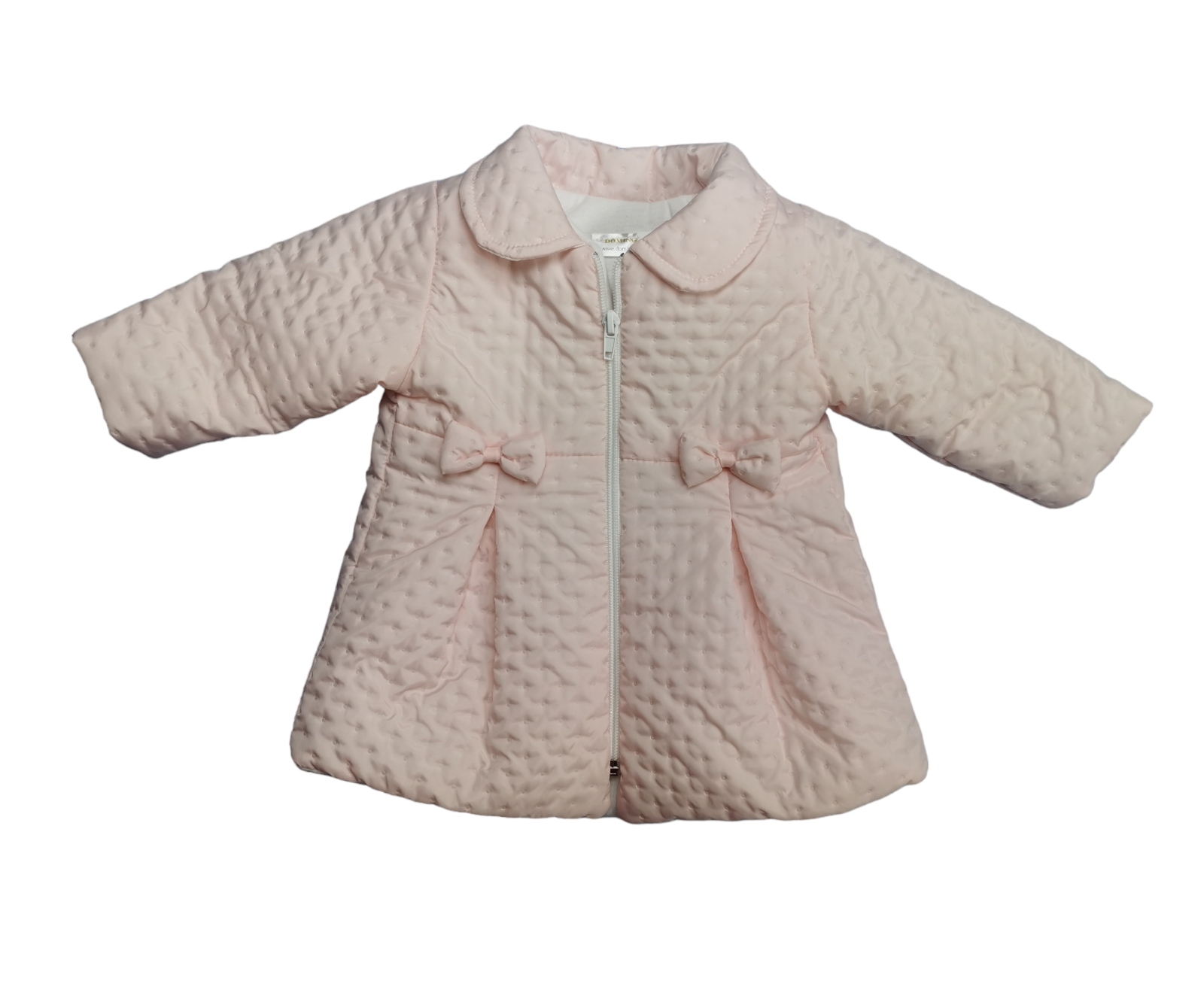 - Стьобане пальто з рожевим коміром, пошите на білій бавовні та додатково злегка утеплене