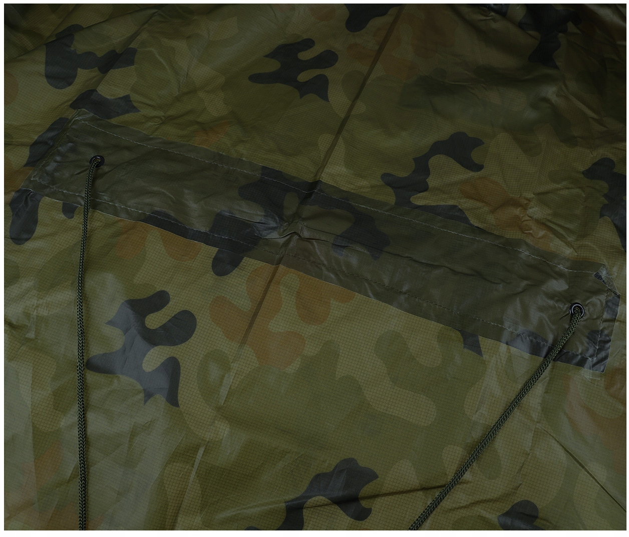 Накидка має застібки для застібання рукавів. Пончо можна використовувати як брезент, брезент, брезент або простий намет.