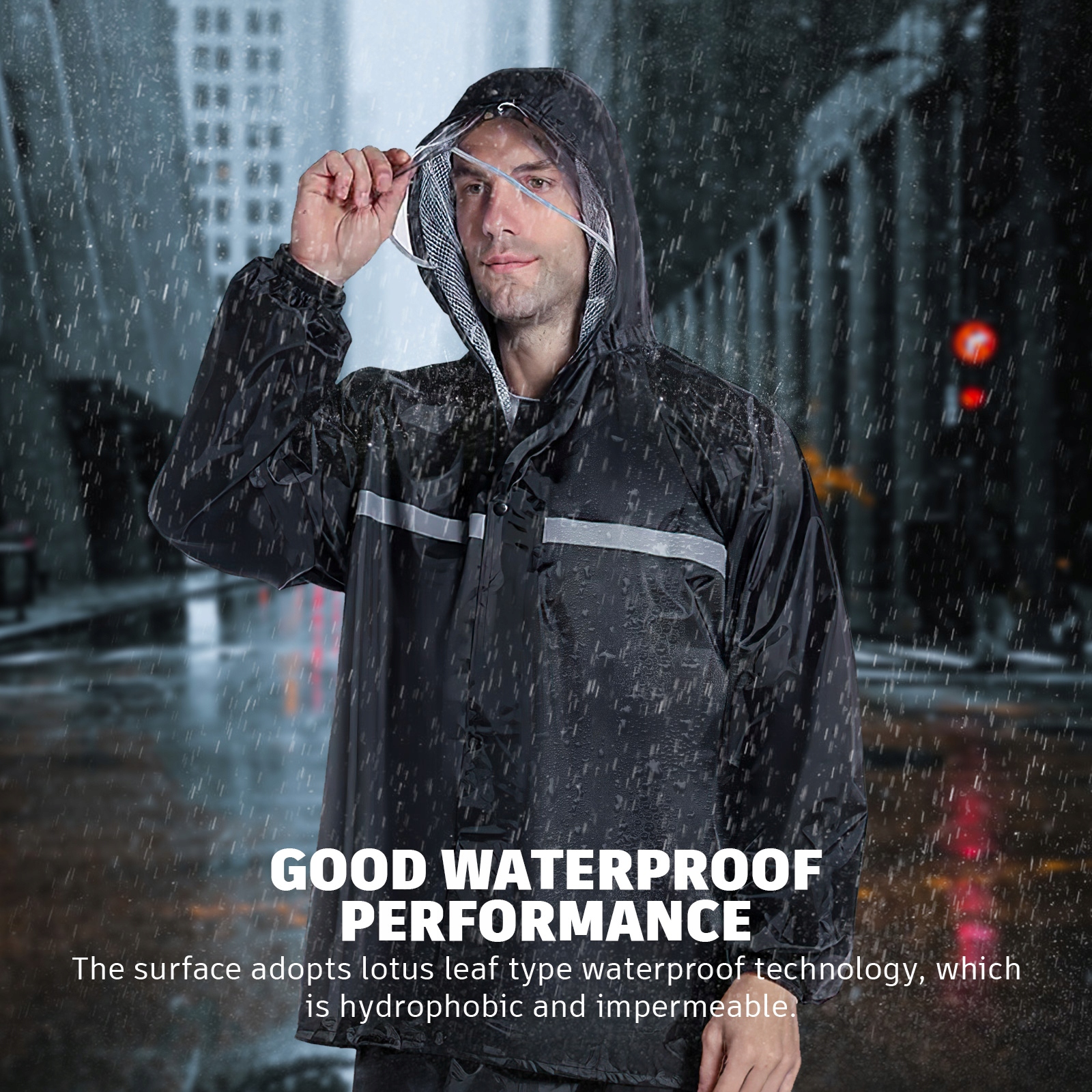 Залишайтеся сухими та стильними з нашим набором плащів із легкої двошарової поліестерової конструкції з прозорим козирком. Цей комплект покриває все тіло, включаючи куртку та штани, тож ви можете залишатися сухими та комфортними за будь-якої погоди.