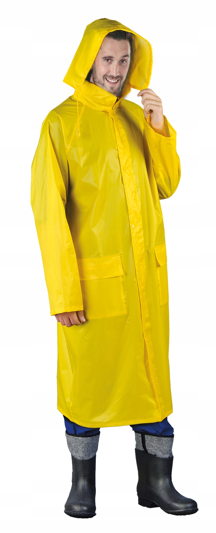 Захисний плащ виготовлений з високої якості тканини з 100% поліестеру/ПВХ , гарантує відмінний захист від дощу. Закріплений блискавкою та додатковими пресами. Гуд закритий на комірі та завантажені ремінці дозволяють швидко вміститися, забезпечуючи захист від повної голови.