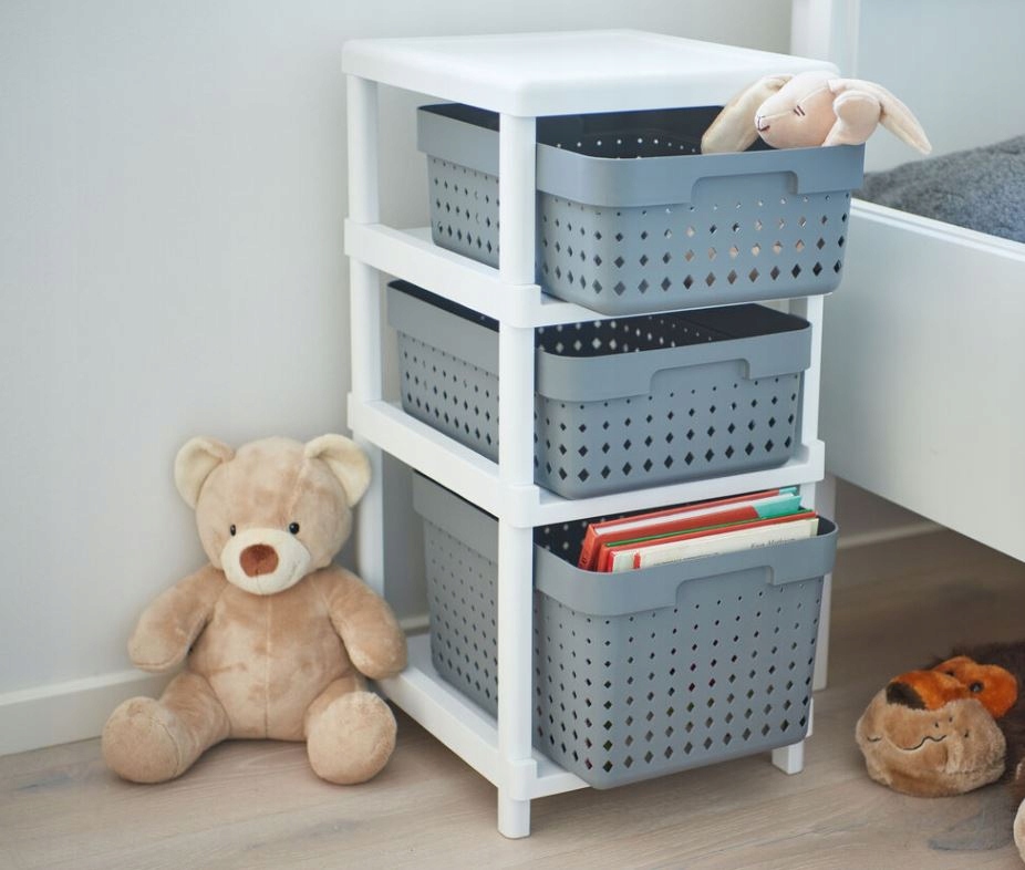 Простий спосіб упорядкувати аксесуари для дому - нехай усі дрібниці нарешті знайдуть своє постійне місце! Стелаж укомплектований трьома полицями - без корзинів. Завдяки простому, скандинавському стилю полиця знайде своє місце у ванній кімнаті, спальні, вітальні або гардеробній. Зручність використання також забезпечується колесами, які дозволяють легко переміщати меблі, і гладкою поверхнею, яку легко чистити.