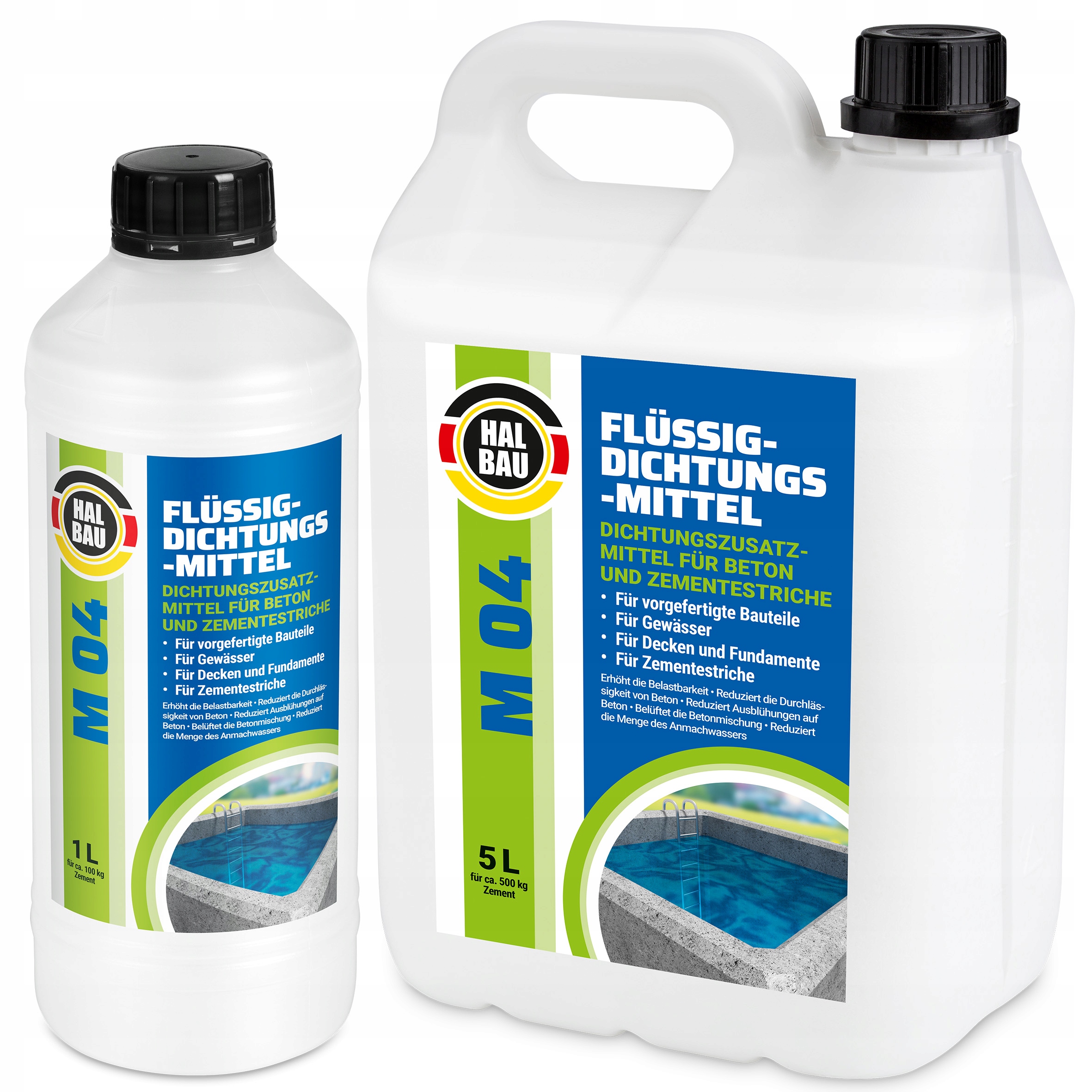 Водоенергетика та пластифікатор для бетонного флюссіг Діхтунгс-Міттел Халбау М04-це сучасна ущільнювача та пластифікація домішка для всіх типів бетону з підвищеною гідроізоляцією та стійкістю до морозів та для цементних молотків. Домішка Flüssig Dichtungs-Mitttel Halbau M04 дозволяє отримати чудові фізичні та хімічні параметри бетону. Домішка Halbau M04 знижує свою проникність до 100%, збільшуючи силу до 15%. Це зменшує кількість заробітку, а також бетонну суміш. Правильно виготовлений і наливний бетон, виготовлений з домішкою Flüssig Dichtungs-Mittel Halbau M04, витримує тиск води до 8 атмосфери. Домішка Flüssig Dichtungs-Mitttel Halbau M04 також обмежує утворення виверження карбонату, не викликає корозії, воно може використовуватися з усіма типами цементу та з будь-яким агрегатом.