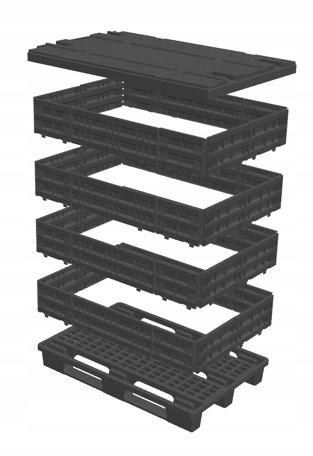 сторона складена сумісна з палітрою з євромами. Він характеризується дуже хорошою міцністю, жорсткістю та низькою ваги. Це універсальний продукт, який можна використовувати у виробничій та логістичній галузі та як елемент складського обладнання.