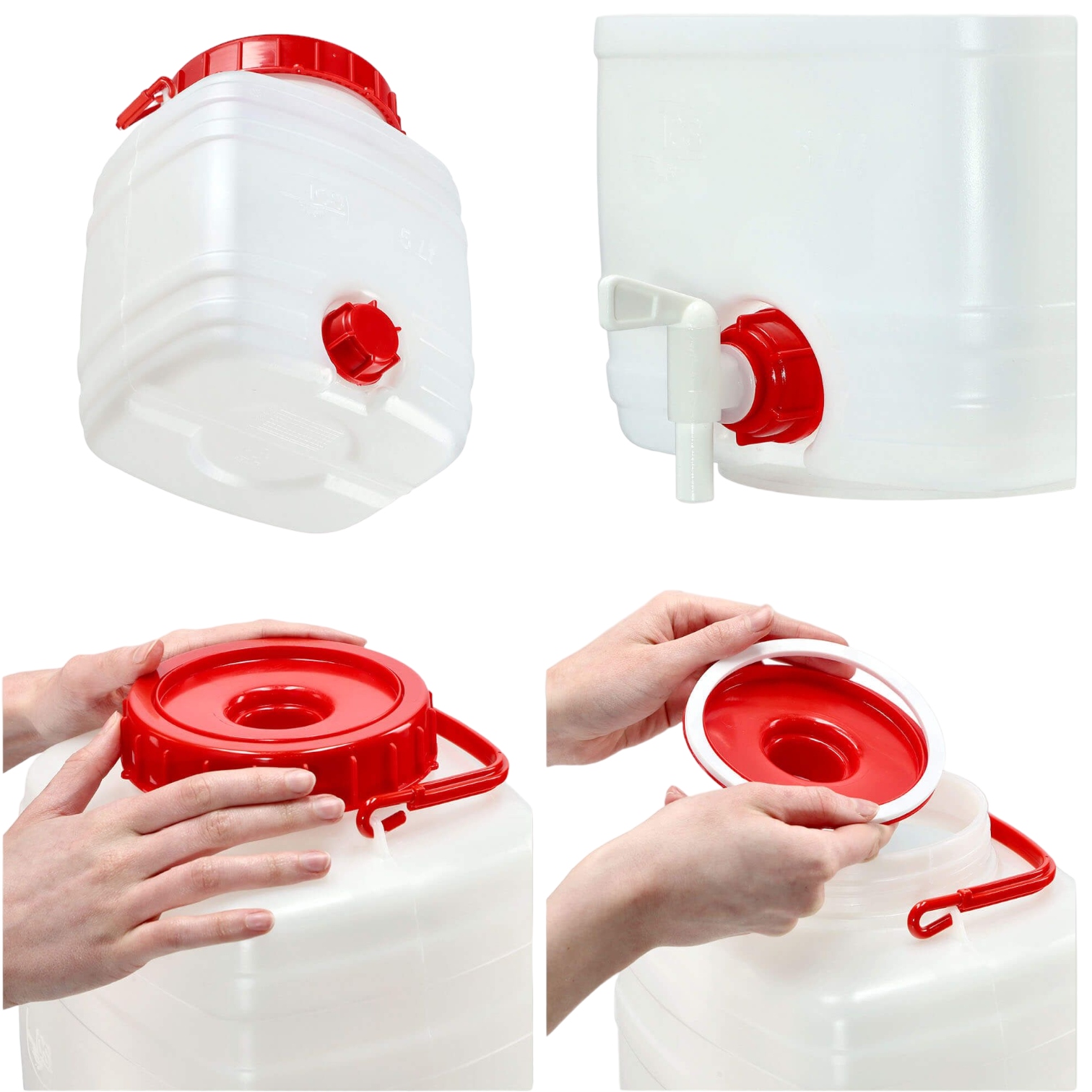 Практична і легка бочка з ємністю 5 літрів, виготовленої з міцного пластику. Оснащений щільною кришкою, зручною ручкою та краном, полегшує зберігання та дозування рідин, особливо води. Має сертифікат відповідності для контакту з їжею.