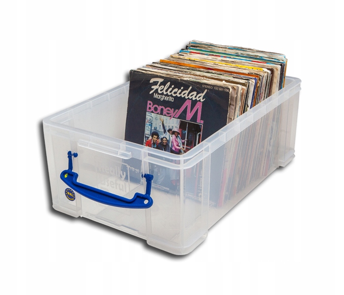Дуже стійка пластикова коробка для синглів/маленьких вінілових платівок, що вміщує близько 100 вінілів у 7-дюймовому форматі.