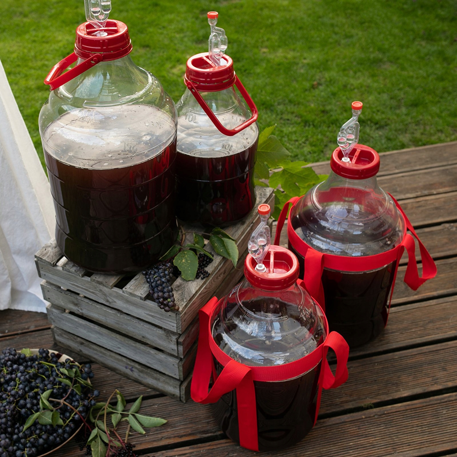 Повітряна кулька для вина з міцного пластику з кришкою та ручкою для перенесення, 15 л - широкий отвір, пластикова ручка, трубка для бродіння, червона кришка, мірна шкала.
