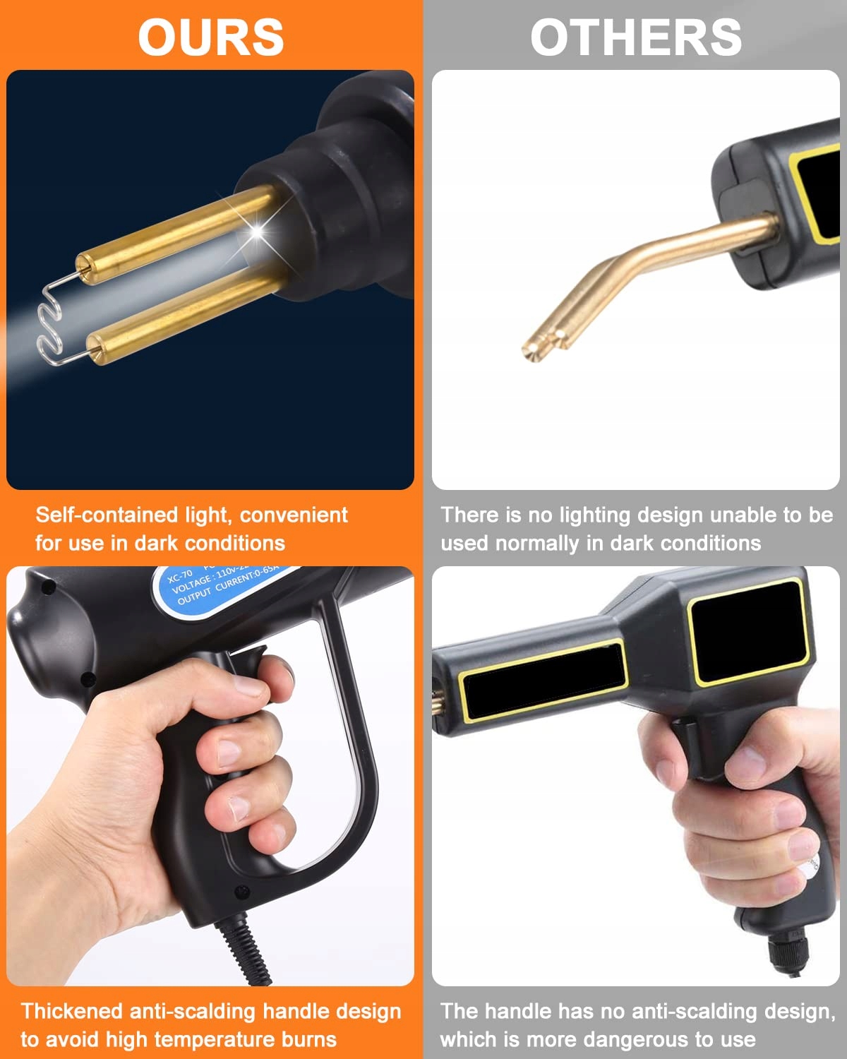 ✅ світлодіодне світло забезпечує достатнє освітлення і дозволяє добре видимість навіть у погано освітлених місцях. Як результат, потенційні тріщини або пошкодження в більш темних районах легко розпізнати і їх можна легко визначити для негайного ремонту. Подвійна труба пластикової зварювальної машини виготовлена з чистої міді, яка має хорошу теплопровідність. Його можна швидко нагрівати до 400 ° C за 3 секунди, що може швидко підвищити ефективність нагріву. Мідна труба нагріває лише зварювальні нігті, тому вам не доведеться турбуватися про спалювання мідною трубою. Смілива ручка, яка запобігає опікам, була розроблена для запобігання дотику гарячого зварювального нігтя. Ефективно ізолює гарячі предмети, запобігаючи випадковим опікам. Ручка ергономічно розроблена і комфортно лежить в руці, тому вона не втомлюється навіть після багатьох годин роботи.