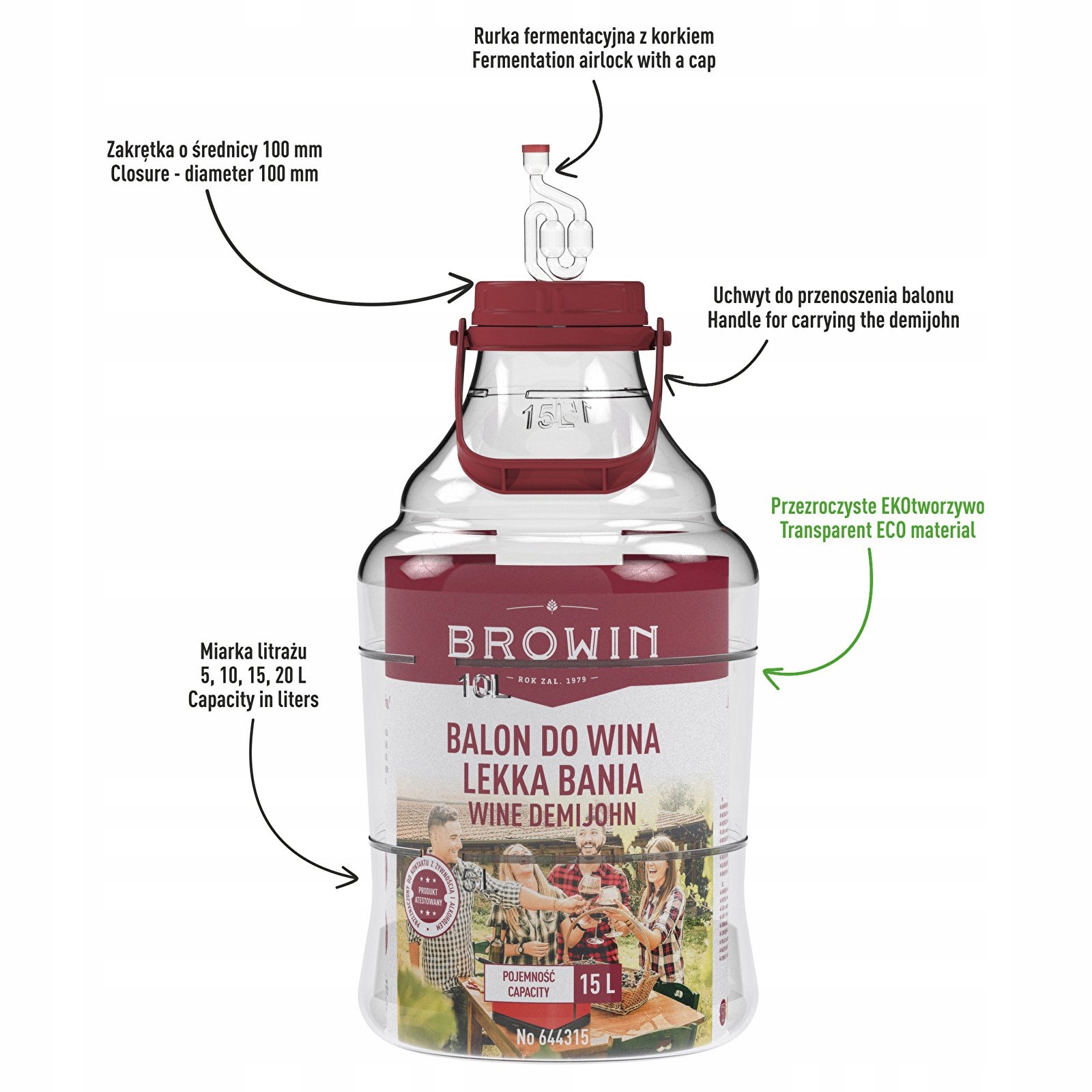 - Широкий отвір з лускою - посудина має широкий отвір, що полегшує наповнення, миття та видалення залишків фруктів після бродіння. Шкала, нанесена на стіну, полегшить наповнення балончика до потрібного об’єму.