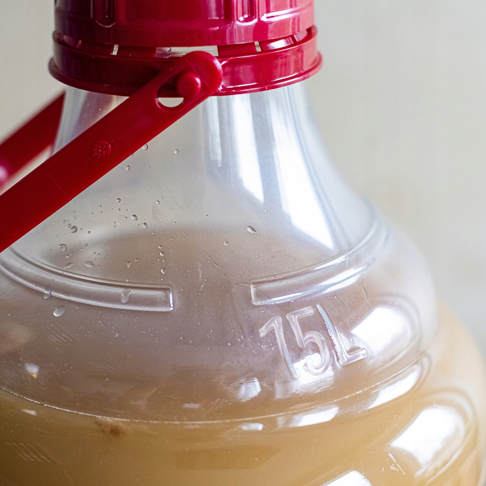 Нерозривна пластикова винна куля з гвинтовою кришкою та ручкою для перенесення, 15 л - широкий отвір, пластикова ручка, трубка для бродіння, червона кришка, мірна шкала.