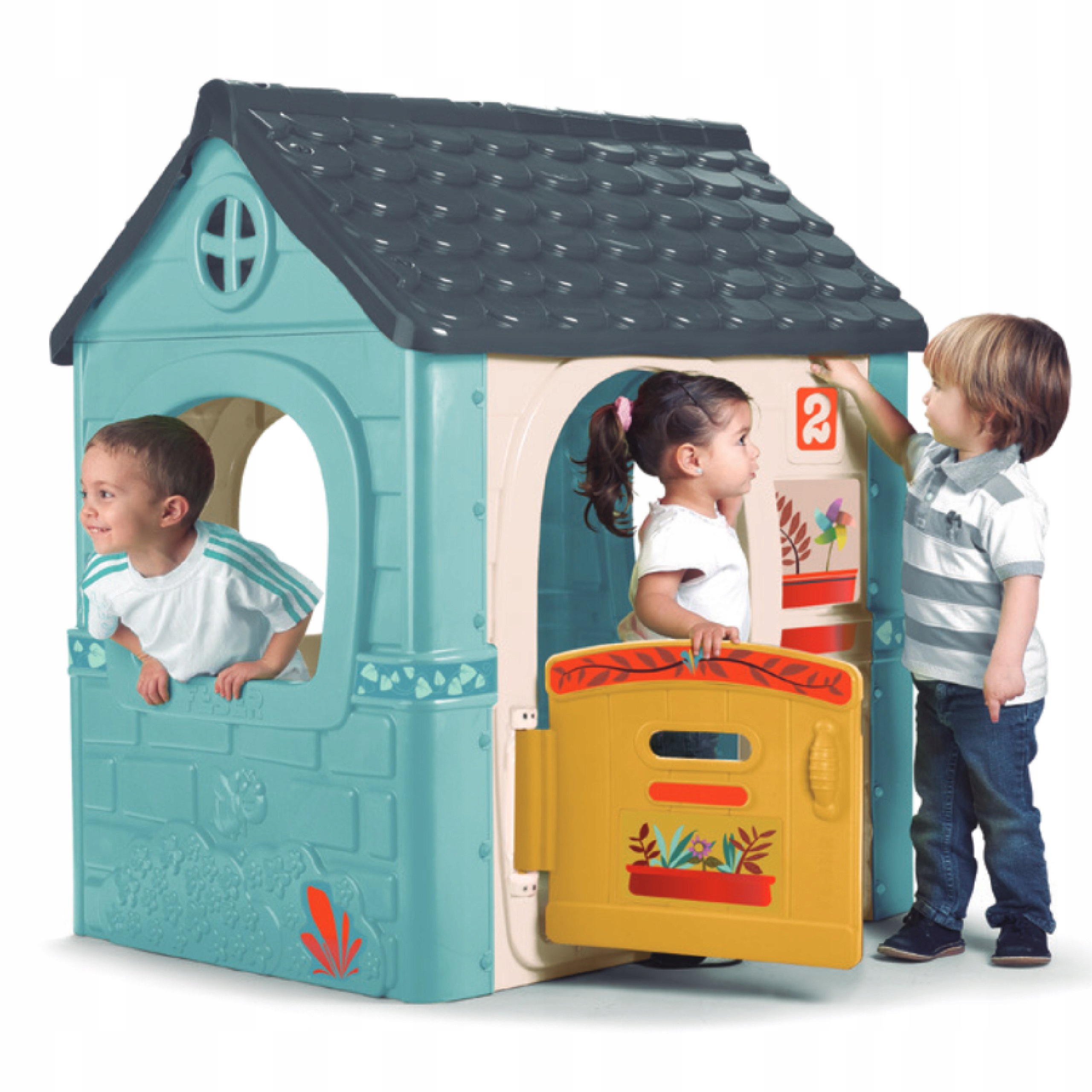 Садовий будиночок Casual від FEBER вирізняється своїми стриманими кольорами, які привертають увагу та водночас гармонійно вписуються в оточення саду. Пастельні відтінки синього, зеленого та жовтого створюють приємну для ока палітру, яка сприяє розслабленню та творчій грі. Приглушені кольори будинку стійкі до вицвітання завдяки покриттю ANTI-UV, яке забезпечує естетичний вигляд будинку протягом тривалого часу, незалежно від погодних умов.
