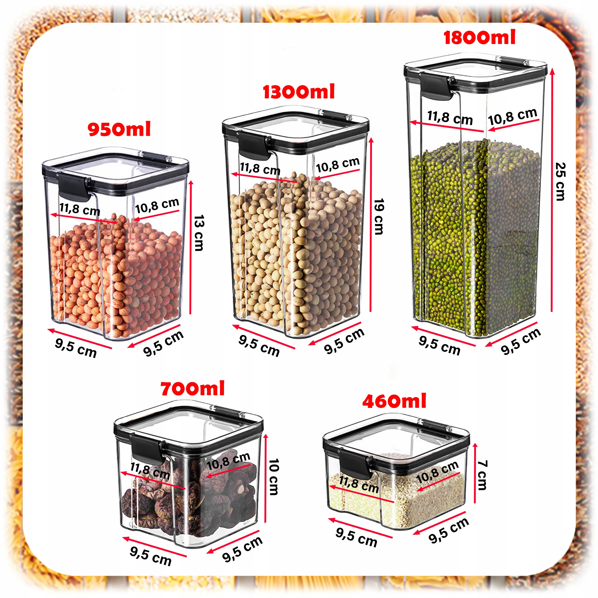 ➖ У набір входять контейнери з наступною ємністю: 2x 1800 мл, 2x 1300 мл, 2x 950 мл, 2x 700 мл і 2x 460 мл, що дозволяє ідеально підходити для виробів різного розміру. Ви можете вільно використовувати їх як для великих порцій, так і для менших кількостей.