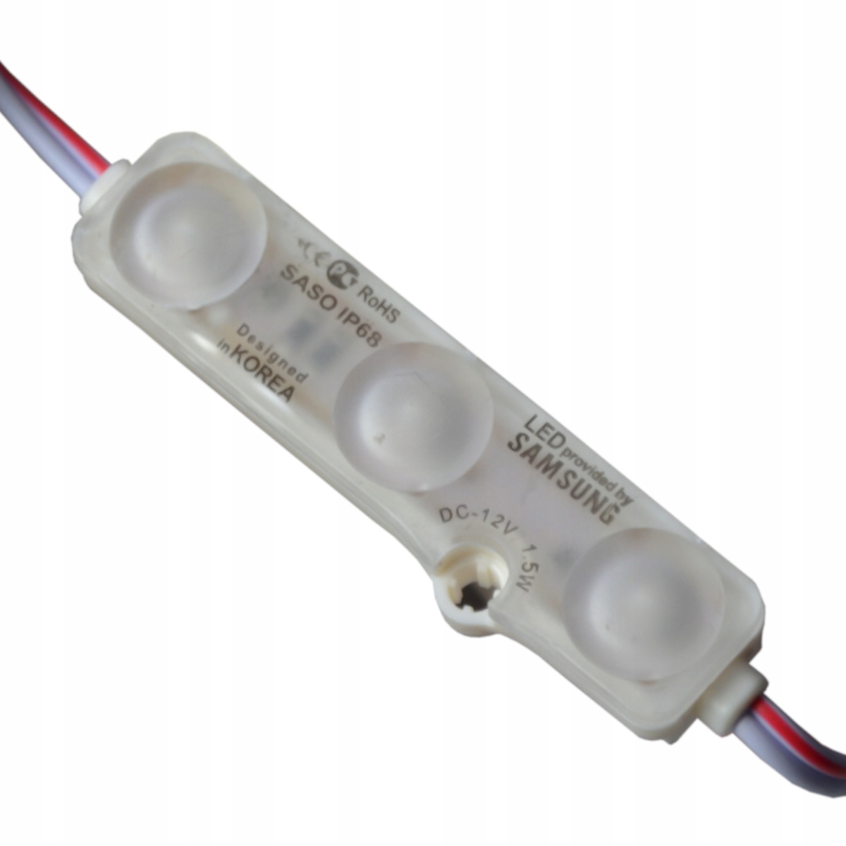 Світлодіодний модуль 5730, пластиковий, 3-діодний, з діодами Samsung, водонепроникний IP65, дуже висока яскравість світла 150-165 люмен, напруга живлення DC 12V, струм споживання 1,5 Вт/модуль, розміри: 67x14x8 мм, з розсіювачем, кут освітлення 160 град. Модулі з'єднуються послідовно по 50 штук кабелями довжиною приблизно 7 см. При підключенні всього комплекту з 50 штук, будь ласка, живіть модулі з обох сторін. Колір світла холодний білий. Спосіб кріплення - шурупами через монтажні отвори в модулі або двосторонньою липкою стрічкою 3М (приклеюється до модулів з нижньої сторони).