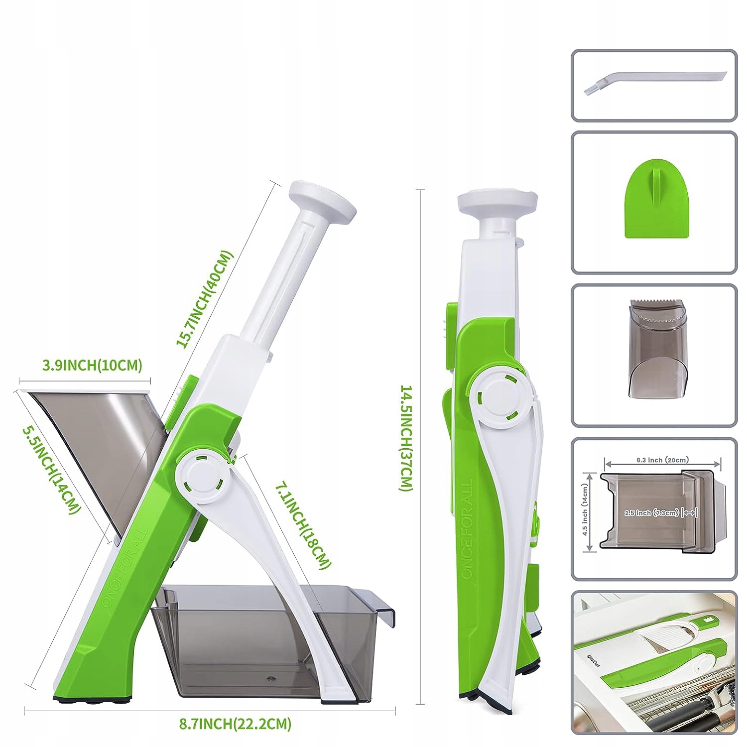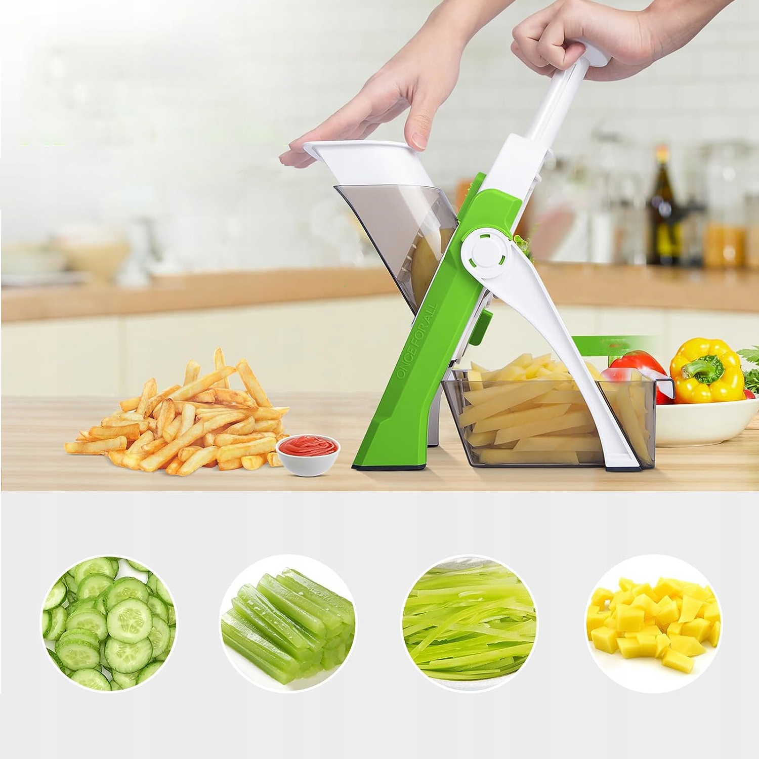 - З кількома варіантами нарізання ви можете швидко нарізати їжу одним натисканням ручки та миттєво готувати нарізані фрукти та овочі, палички, скибочки, смужки та шпажки ресторанної якості.