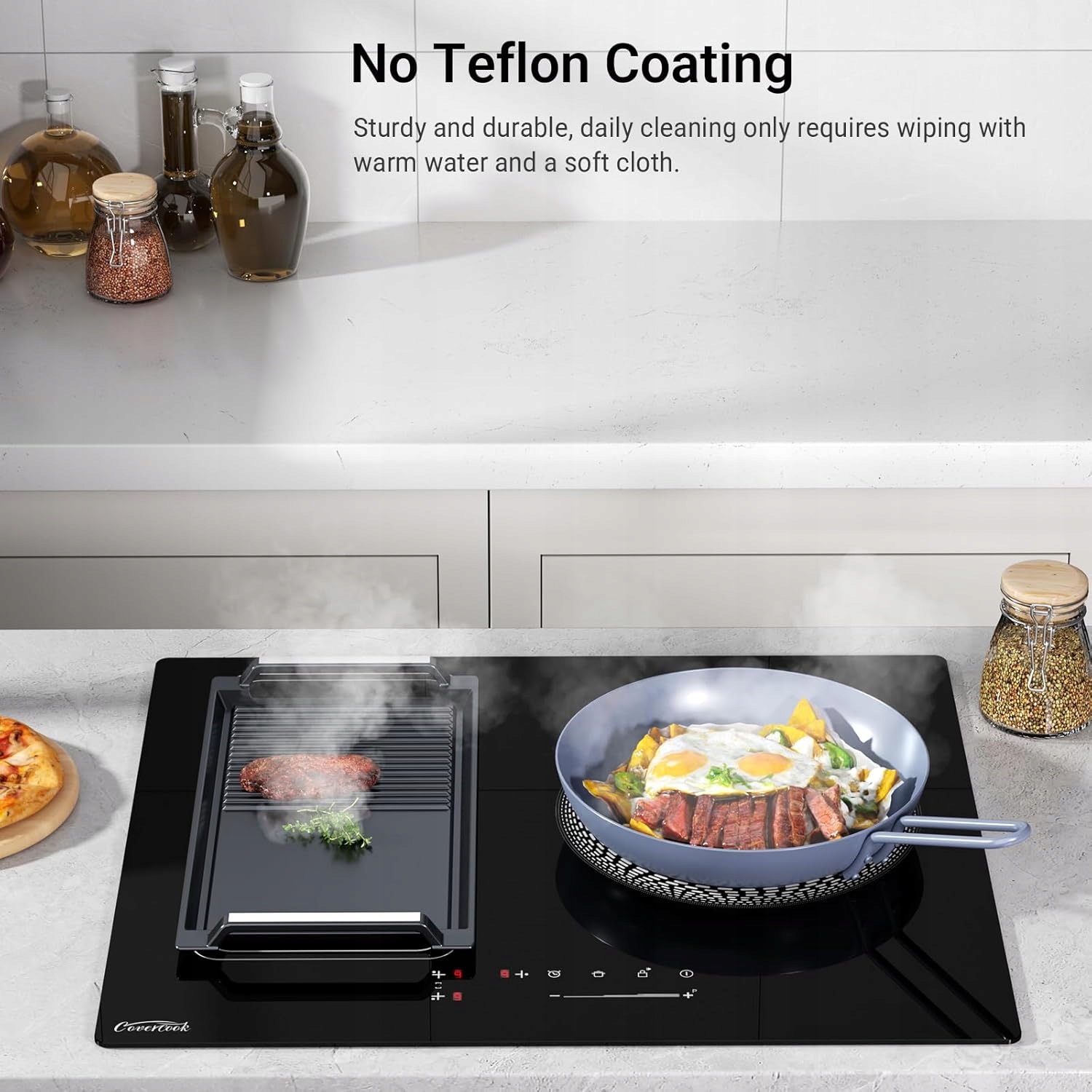 Багатофункціональна плита-гриль COVERCOOK - ідеальне рішення для приготування різноманітних страв вдома, на грилі або в духовці. Завдяки поєднанню гладких і ребристих поверхонь ви можете смажити м'ясо і овочі одночасно, зберігаючи повний смак.
