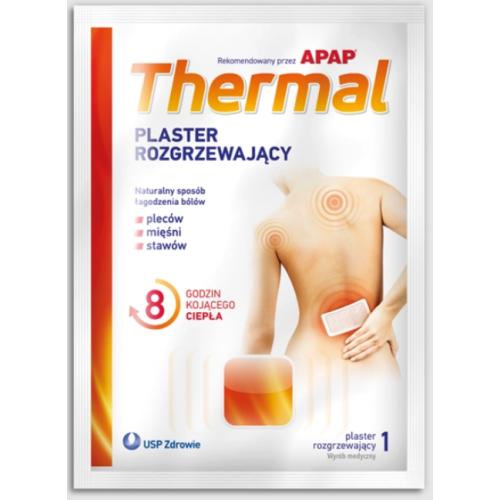 APAP Thermal - це пластирі з розігріваючим і розслаблюючим ефектом, зменшують відчуття болю. Цей продукт випромінює тепло в результаті нагрівання сипких інгредієнтів (порошок заліза), поміщених у пакет пластиру. Пластир Apap Thermal розігріває шкіру і м'язи в місці спайки (на глибину приблизно 4 см). Завдяки цьому посилюється кровотік у хворому місці і «вимиваються» медіатори болю. Після прилипання до шкіри пластир поступово нагрівається і досягає максимальної температури приблизно через 30 хвилин, а ефект зберігається протягом 8 годин.