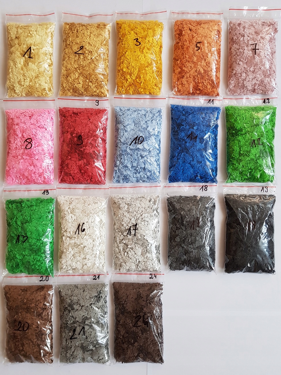 Ми пропонуємо першокласні акрилові пластівці. Упаковки декоративних пластівців вистачає приблизно на 5-10 м2 (0,1 кг) в залежності від очікуваної щільності. Пакет необхідно розділити на кілька рівних частин, щоб пластівці розподілилися рівномірно. Луски слід наносити відразу після фарбування 2,5 м2 вологої поверхні. Для додаткового захисту поверхні та естетичних цінностей рекомендується додатково використовувати безбарвний поліуретановий лак. Використання поліуретанового покриття на пластівцях не обов'язково. З одного боку, це додатково захищає пелюстки від випадання, а з іншого – обмежує протиковзкий ефект.