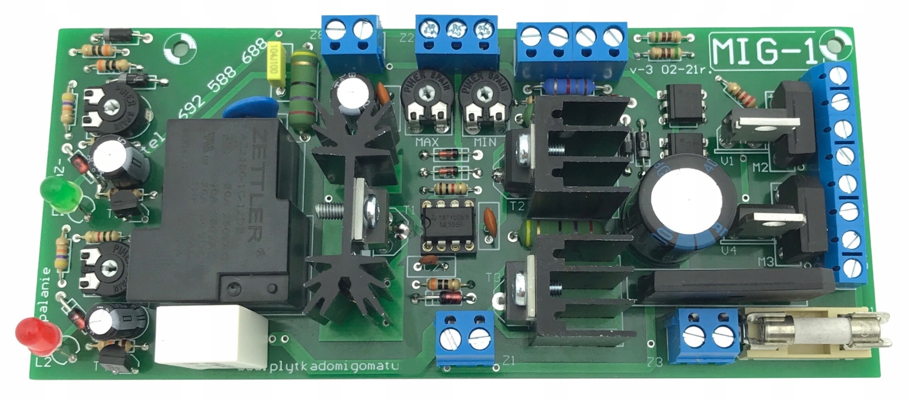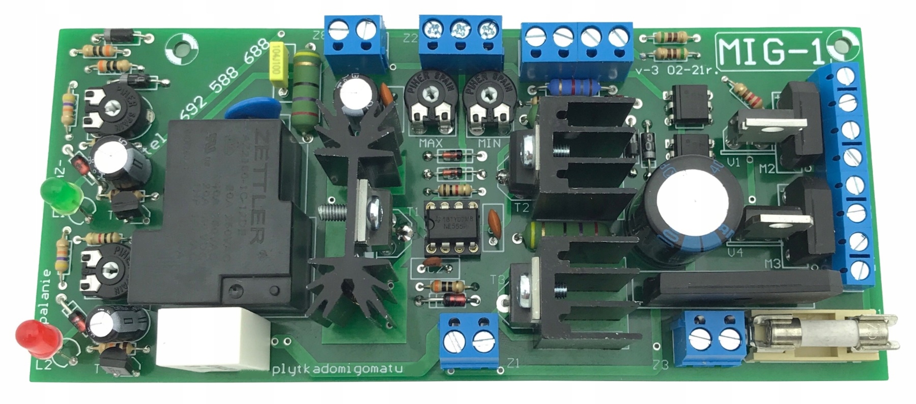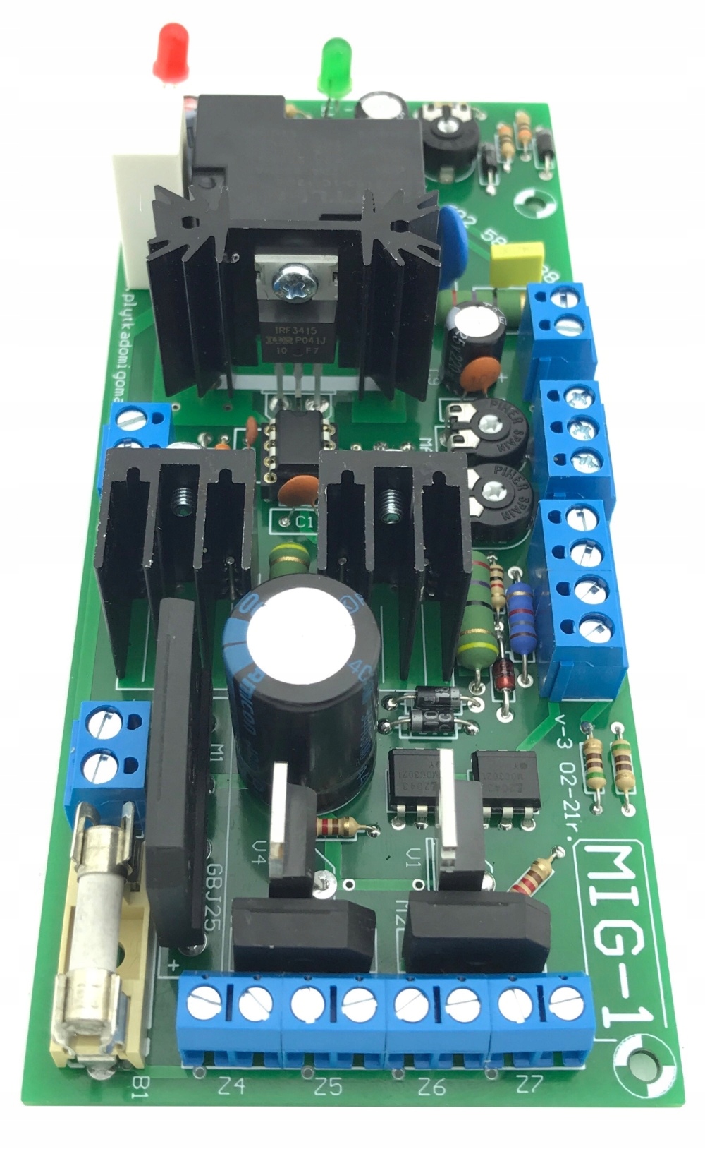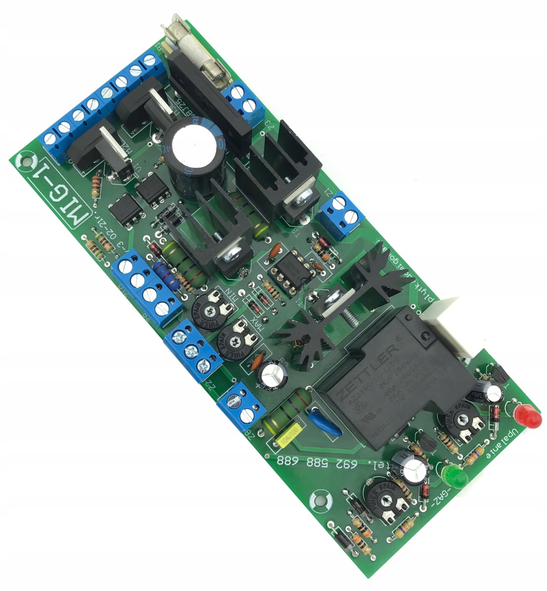 В набір входить плата MIG-1 і потенціометр регулювання швидкості подачі дроту, захисний захист від теплового перевантаження і світлодіод індикації перегріву.