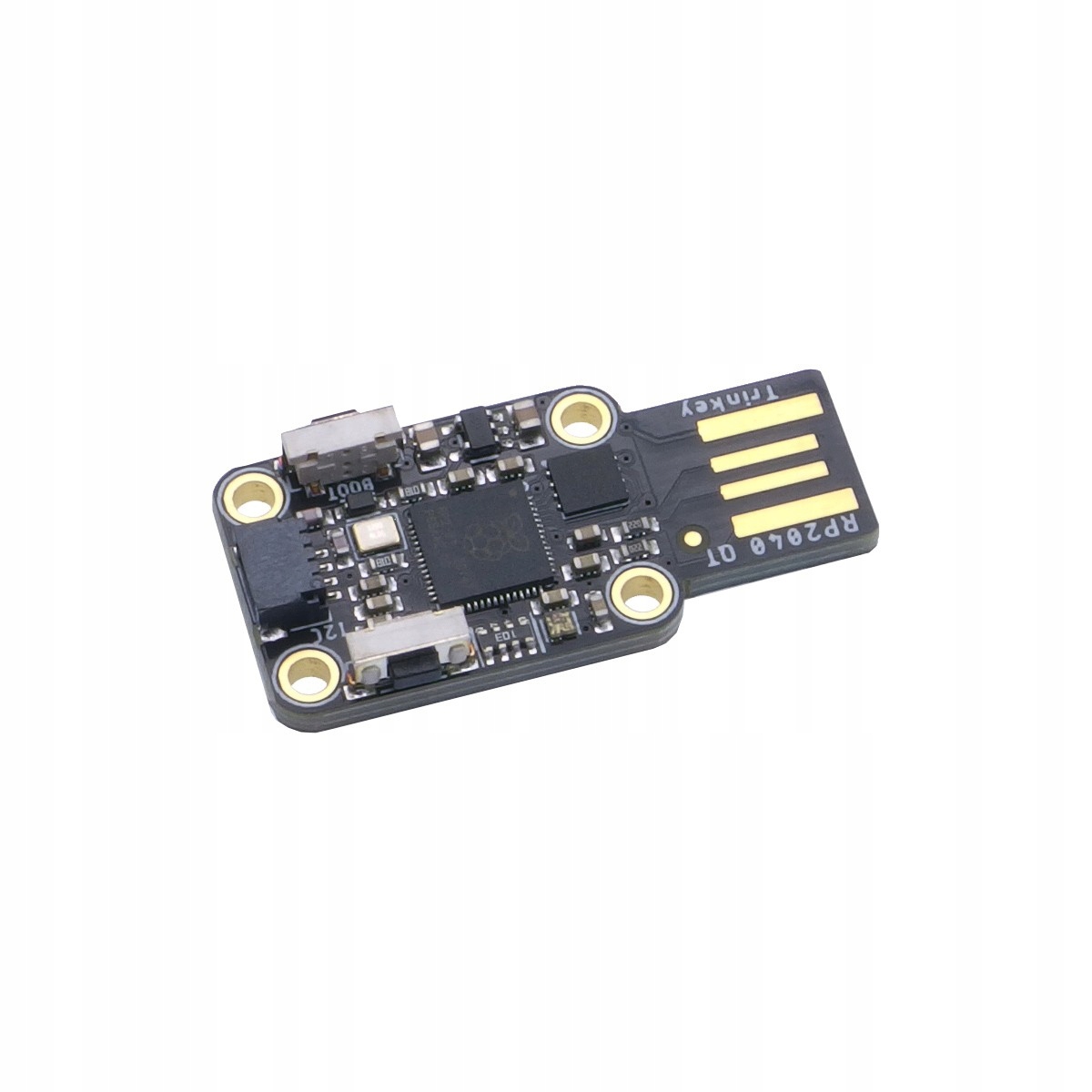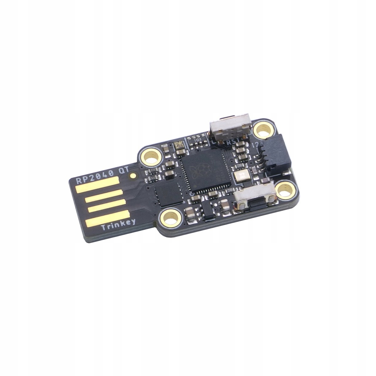 Adafruit Trinkey QT2040 — це плата у формі USB-ключа, оснащеного мікроконтролером RP2040, розробленого компанією Raspberry Фонд Пі. Система має два ядра ARM Cortex M0+, що працюють на частоті до 133 МГц, і 264 КБ оперативної пам'яті. Мікроконтролер не оснащений флеш-пам'яттю, але плата має зовнішню пам'ять об'ємом 8 Мб, підключену через інтерфейс QSPI.
