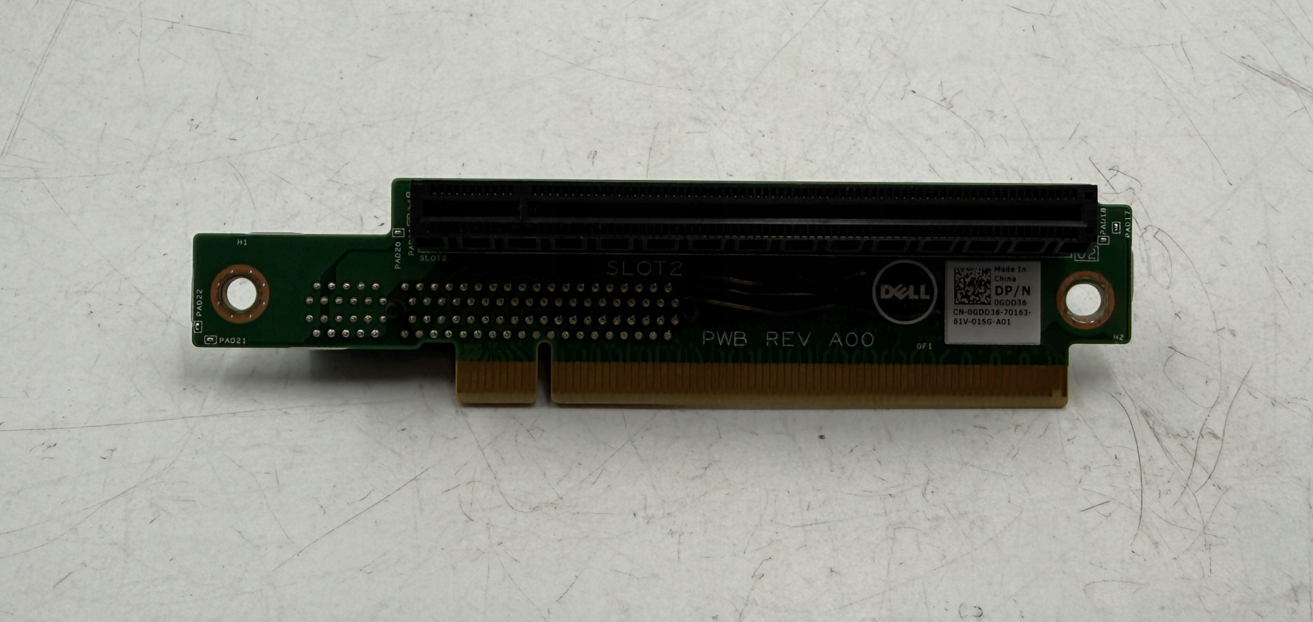 Пропоную оригінальний райзер Dell 0GDD36, призначений для сервера PowerEdge R230. Модуль знятий з робочого блоку і повністю працездатний - дозволяє встановлювати додаткові карти PCI-Express в корпус 1U, зберігаючи повну сумісність з материнською платою і структурою сервера.