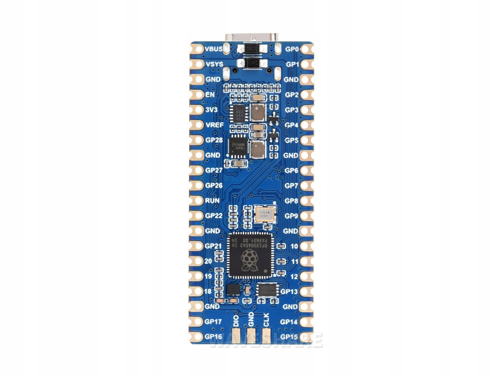 - Мікроконтролер RP2350A з двоядерною архітектурою: Arm Cortex-M33 і Hazard3 RISC-V, з тактовою частотою до 150 МГц