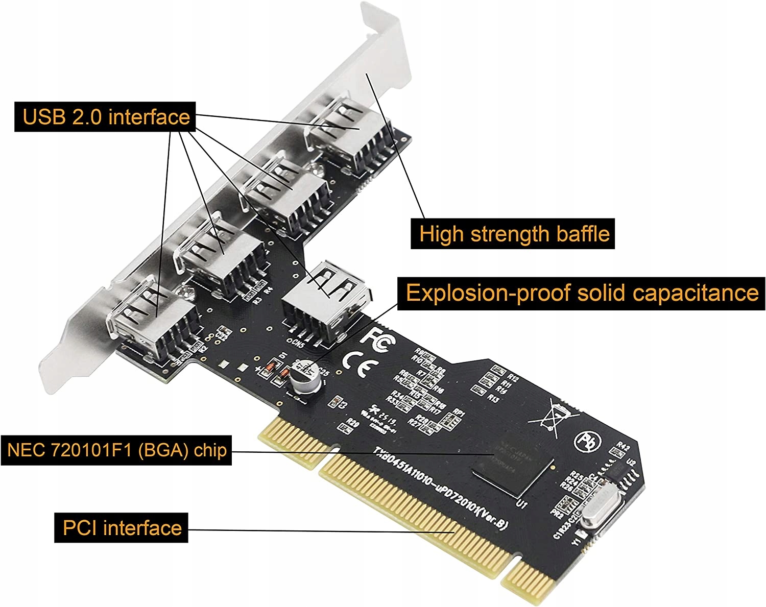 Карта розширення PCI USB 2.0 містить 1 вбудований порт USB Type-A та 4 зовнішні порти USB, які можна використовувати одночасно. Основний керуючий чіп Nec-Japan, висока стабільність і сумісність, передача даних до 1,5 Мбіт / с (низька швидкість) / 12 Мбіт / с (повна швидкість) / 480 Мбіт / с (висока швидкість). Підтримує функцію гарячого підключення та пробудження, дозволяє користувачеві знімати та замінювати несправний блок живлення або плату жорсткого диска, не вимикаючи систему та не вимикаючи живлення, покращуючи здатність системи до аварійного відновлення, масштабованість та гнучкість відновлення. Підтримує до 127 пристроїв, які можна використовувати для підключення знімних жорстких дисків USB, USB-мишей, сканерів, клавіатур, цифрових камер, принтерів тощо. Підтримувані операційні системи: Windows 98SE / Me / 2000 / XP / NT 4.0 / XP 64-bit / Vista , Linux, Mac (WIN10 не підтримується)