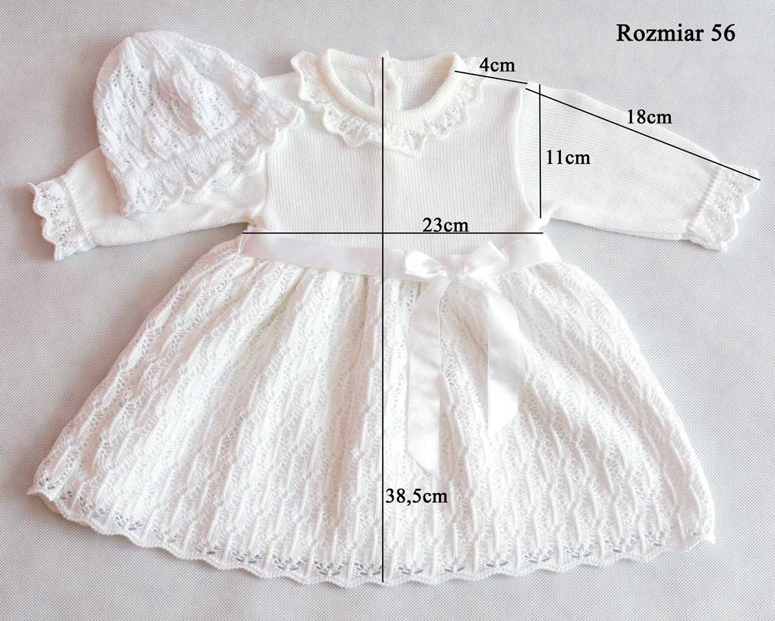 Гарна біла сукня для дівчинки, ідеальна для хрещення. У комплект входить шапочка і дитяче плаття. Сукня прикрашена ніжним, ажурним візерунком. Ззаду застібається на кнопки. Додатково сукня прикрашена атласною стрічкою з квіткою.