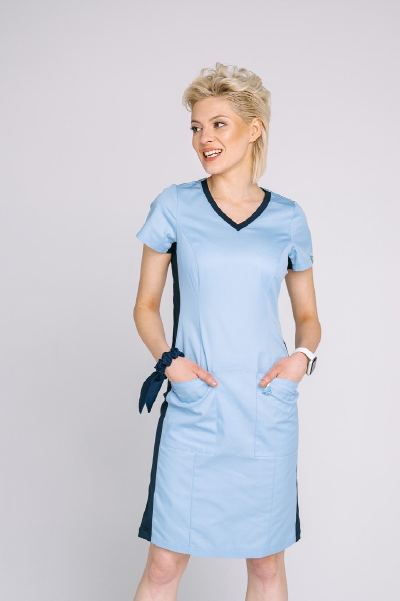 Медичне плаття Klara — це сучасна пропозиція для жінок, які працюють у клініках, лікарнях та кабінетах лікарів. Це дуже зручний крій простого, класичного плаття, прикрашеного болтами на кожній кишені та розрізі, що, крім додання шарму, зміцнює виріб, а трикотажні смужки вшиті в боки сукні та декольте, роблячи простір. сукня легка та гнучка.