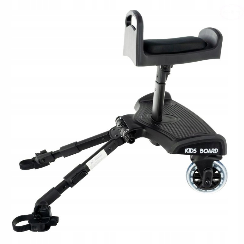 Універсальна платформа з тролейбусним сидінням - дитяча дошка. Максимальна вага дитини до 20 кг. Дитина на платформі може сидіти або стояти. Зручне сидіння для піни з ручкою для прилипання. Інноваційна система гачка дозволяє швидко розбирати платформу. Колеса, що знаходяться, збільшують комфорт дитини під час ходьби по нерівності. Система регулювання виправлення дозволяє встановити платформу практично будь -яку коляску. Він також має відстань на три етапи від коляски. Можливість демонтажу сидіння.