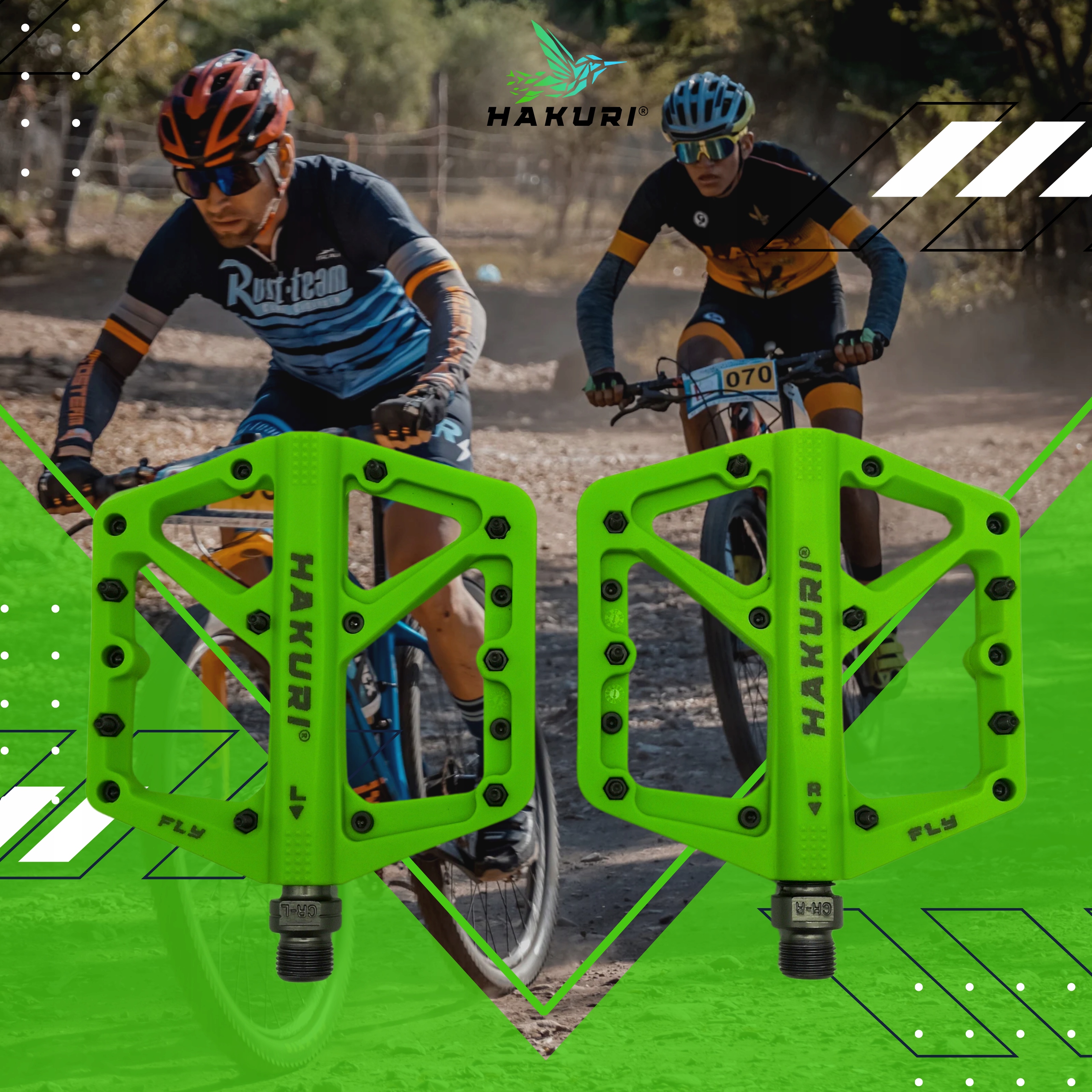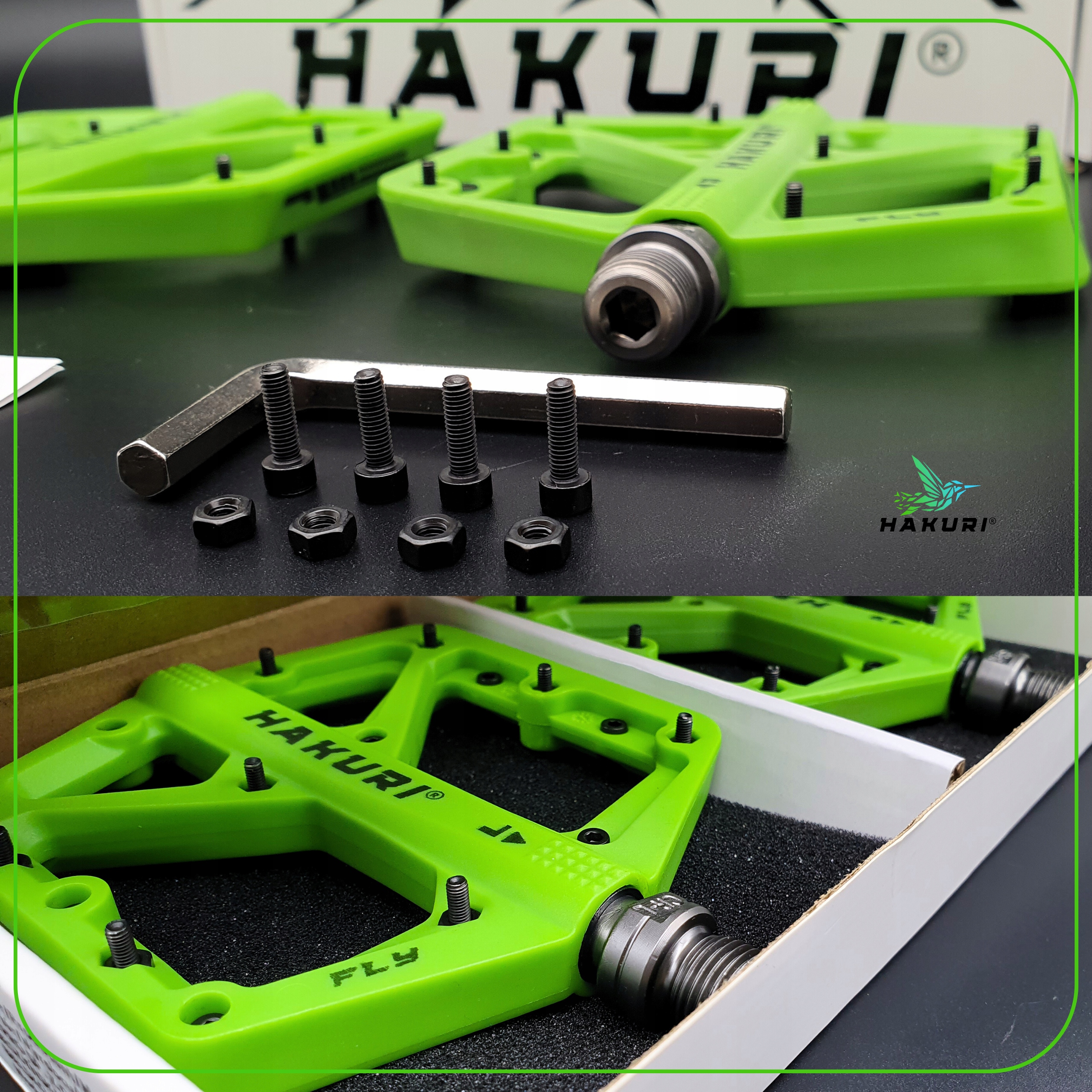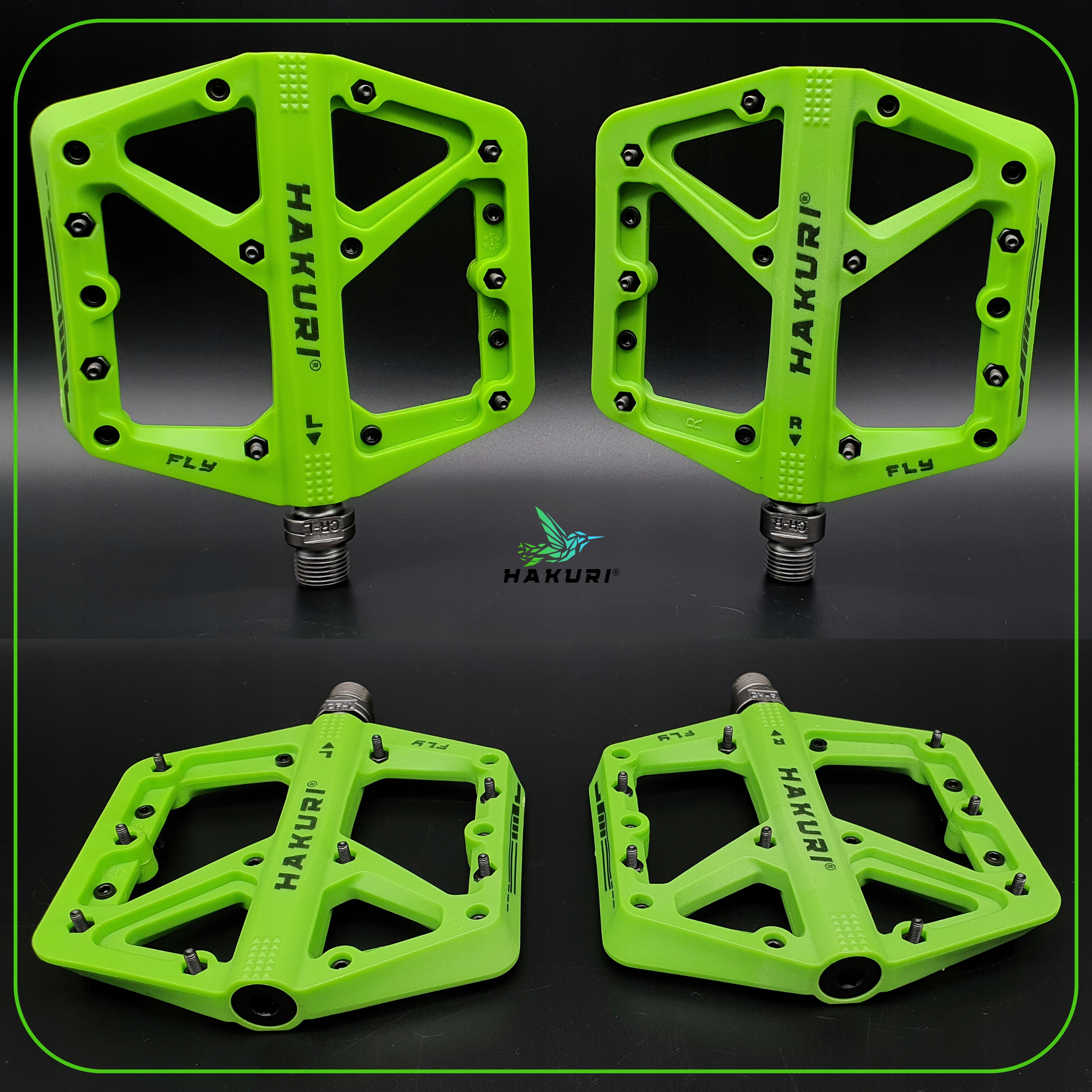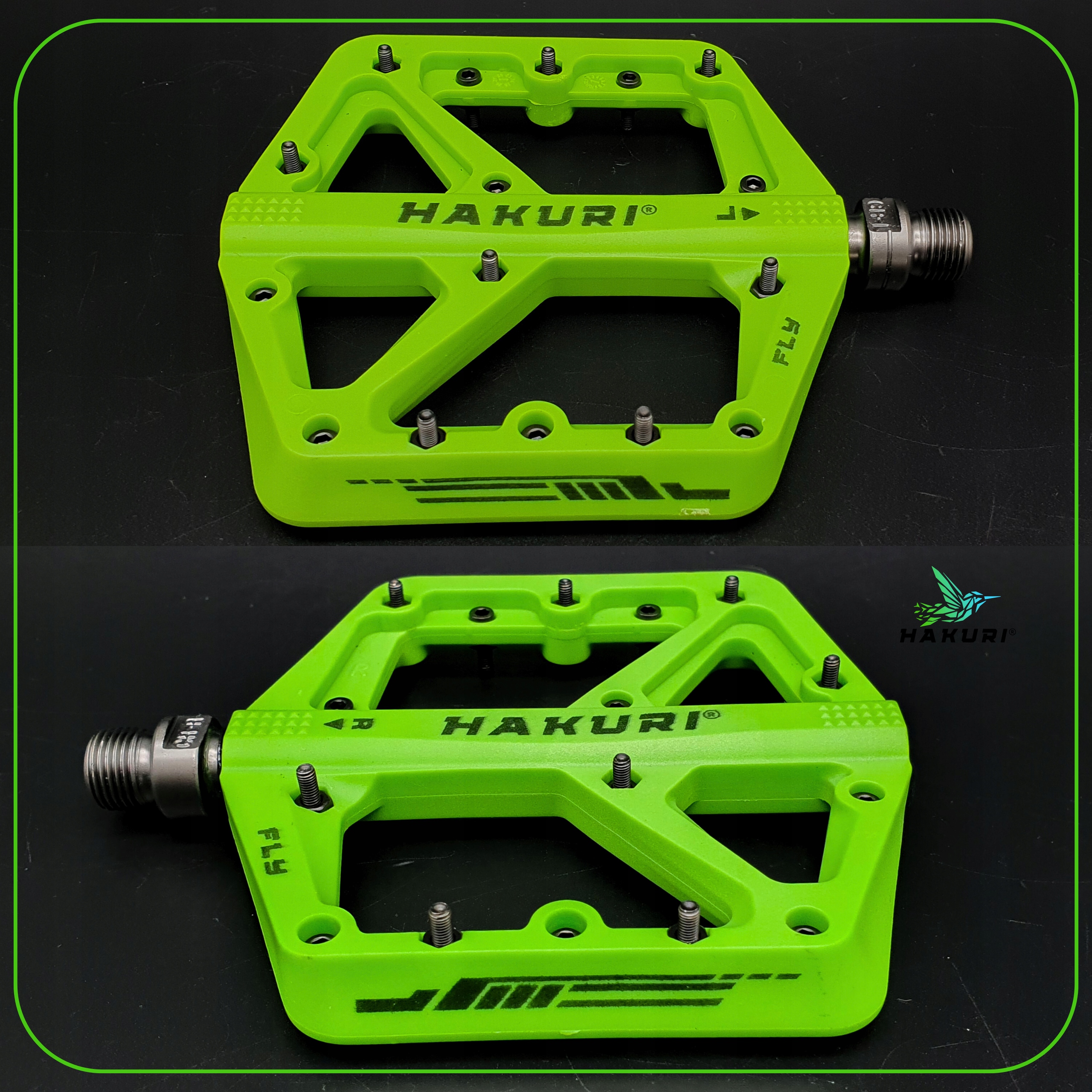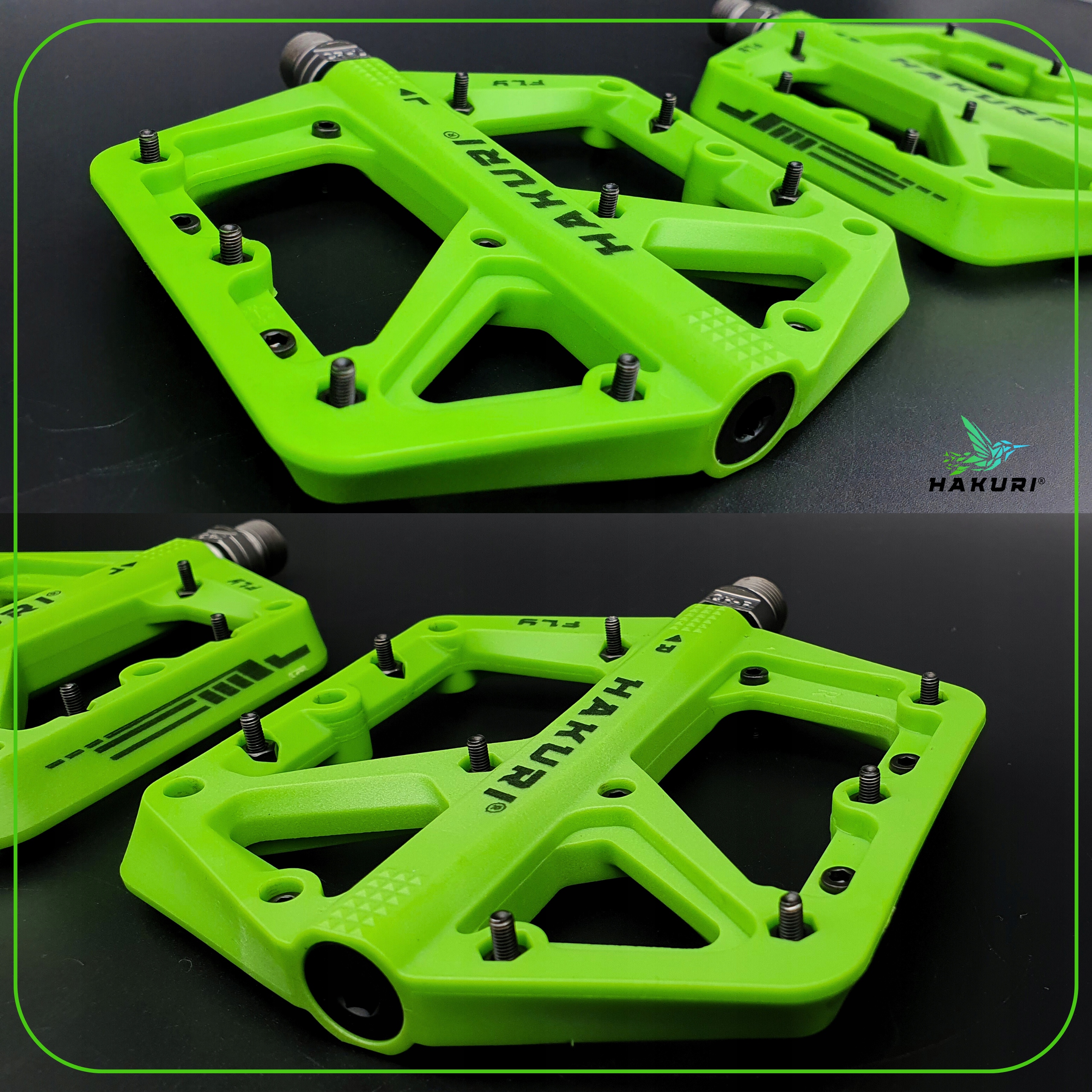 Зустрічаються з педалями мухомор Hakuri® Green -створені для велосипедистів, які цінують максимальний контроль, надійну адгезію та довговічність у будь-яких умовах . міцний нейлон та велика поверхня підтримки , ідеально підходить для інтенсивного MTB, ендуро або DH.