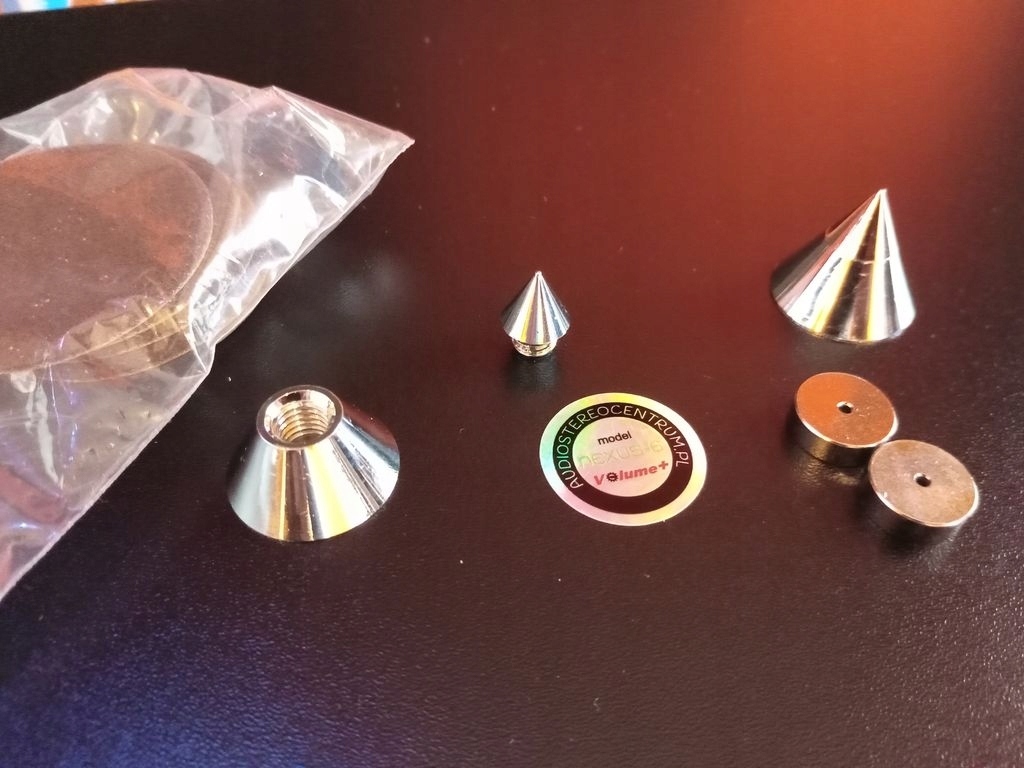 ВИДИТЬСЯ НА ФОТО - ОСНОВА з регульованими шипами (на шипи гострі, тому в набір входять металеві ковзанки, щоб не подряпати комод, стіл тощо) Крім того, 4 шматки великих 50-міліметрових фетрових наклейок, які можна приклеїти будь-де на платформі.