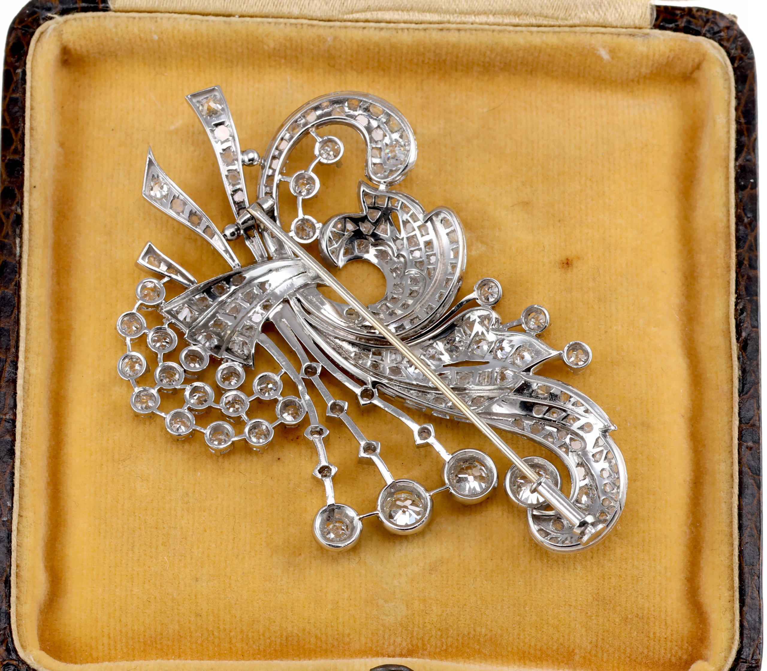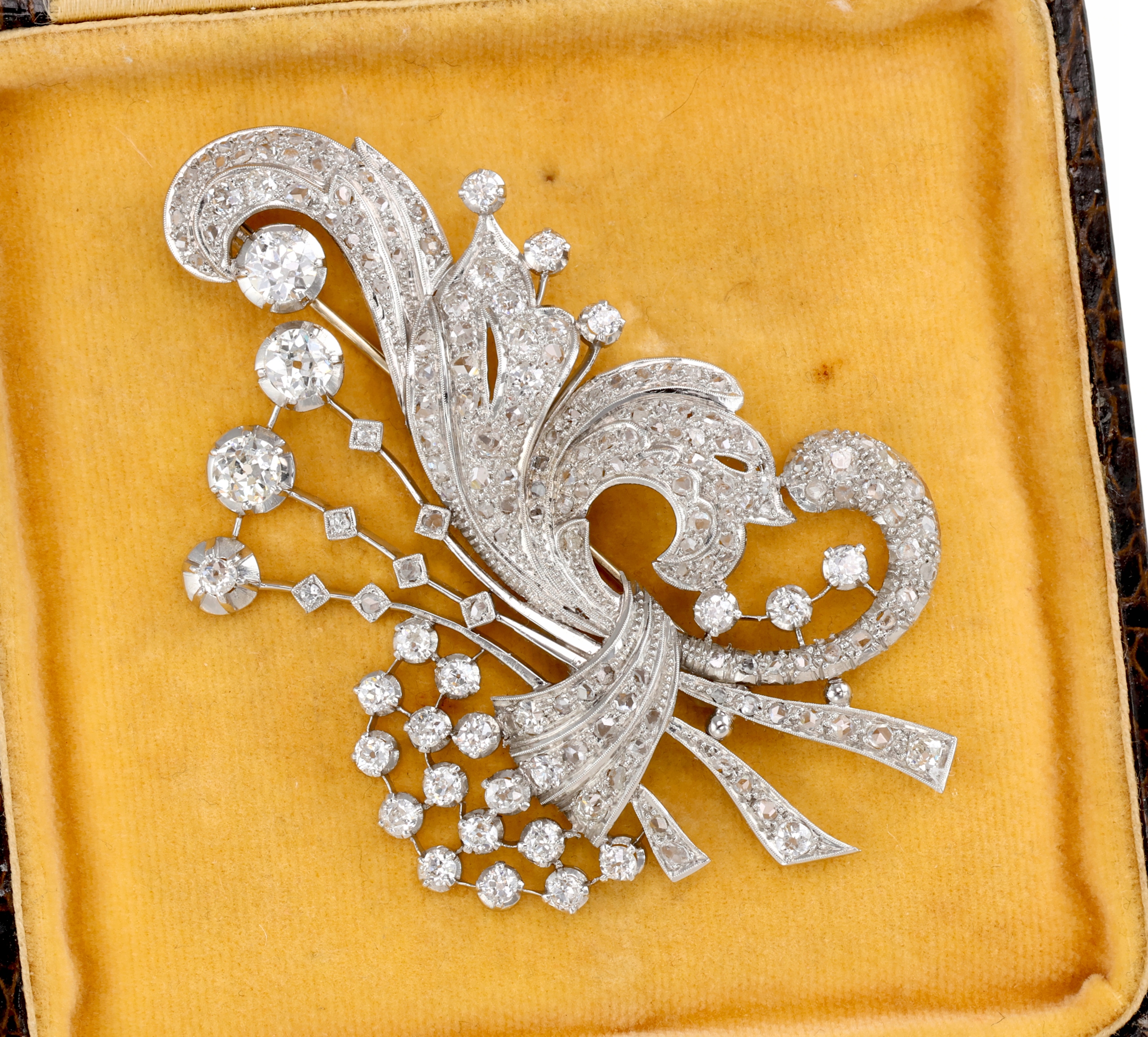Предмет продажу вражаючий брошка з платини 900 проби, вагою 24,25 г, прикрашена багатою гамою діамантів у старовинних огранюваннях 8/8, 16/16 та розетками (загальна 3,29 карат). У ключових точках композиції розміщені три діаманти старої огранки вагою 1,38 карата, кольором H-J і чистотою Si. Форма базується на розширеному асиметричному розташуванні, типовому для ювелірних виробів 1930-1940-х років. Унікальна, незвичайна прикраса.