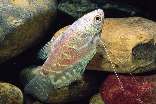 Платиновий гурамі (Trichogaster trichopterus) — лабіринтова риба з Азії. Зараз вони мають розмір приблизно 4-5 см. Платиновий гурамі - кольоровий різновид золотого гурамі, який також отримують з мармурового гурамі. Ці риби виростають до досить великих розмірів, тому їх слід утримувати у великих акваріумах. Ці риби польського заводчика, а не імпортні. Як лабіринтові риби, вони отримують кисень з повітря. В акваріумі вони займають середню і верхню зони. Статевозрілі особини будують гнізда і славляться своїми цікавими шлюбними ритуалами. Рибу легко утримувати, добре підходить для початківців.