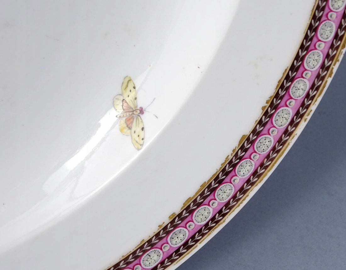 глибока, кругла, з дном із трохи виступаючим круглим краєм. По периметру — подвійний позолочений комірець, між позолотою — тонкі ніжні гілочки та овальні візерунки — все в рожевому, волошково-блакитному та ніжно-жовтому кольорах. Крім того, на нашийнику три різнокольорових метелика, як і два інших у дзеркалі. У центрі дзеркала — кругле поле в кольорах коміра, з дубовим листям.