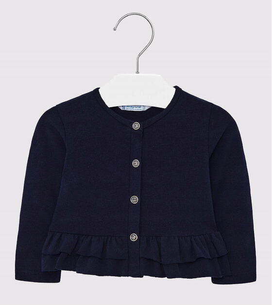 Жакет з довгим рукавом для дівчинки. Круглий виріз. Застібається спереду на кнопки. Низ оброблений подвійним воланом. Довжина стегна. Гнучкий, еластичний і приємний на дотик трикотаж. Колір: темно-синій