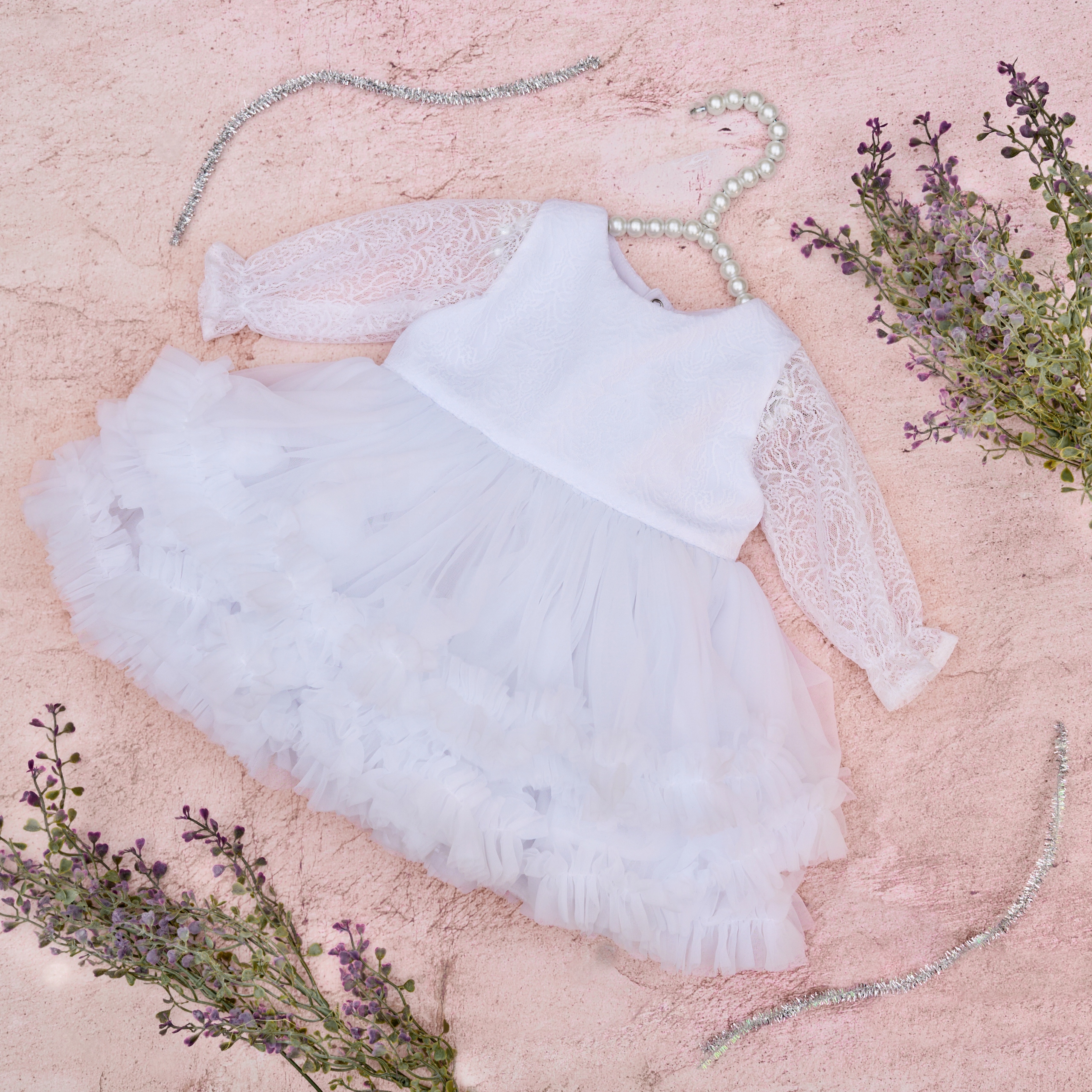 сукня з тюлю inez - це унікальна пропозиція для особливих випадків, таких як хрещення, весілля чи фотосесія. Поєднання делікатного, білого мережива та тюлю створює дивовижний ефект. Вершина сукні Inez - це мереживо з крихітними квітами на бавовняній підкладці та чарівних рукавах, закінчених еластичними смугами. Дно - це два шари тюлю, які були завершені з прикрашеним фріллом, завдяки якому ми отримуємо ефект типу принцеси. На спині сукня кріпиться трьома зручними знімками. Сукня цілком на бавовняній підкладці.