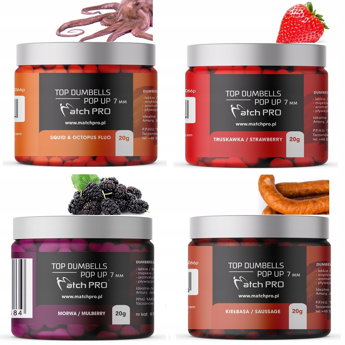 серії найвищої якості валиків (дамби) у розмірі 7 мм найвищої якості. Довгі та інтенсивні тести цих приманок дозволили їм вдосконалити свій склад та властивості, щоб вони були дуже ефективними в будь -яких умовах. Що відрізняє спливаюче гантелі MatchPro Top Duppells - це ідеальна м'якість, завдяки чому риба, ймовірно, завантажує її. Унікальна легкість приманки забезпечує дуже природну поведінку у воді, що підвищує ефективність риболовлі. Вискакування Top MatchPro Dumells дуже ароматні, що тривалий час роздають аромат у воді, що перетворюється на велику кількість укусів. Різноманітність ароматів та кольорів дозволяє кожному рибалці адаптуватися до поточних умов у рибальстві. Спливаюча версія (плаваюча).