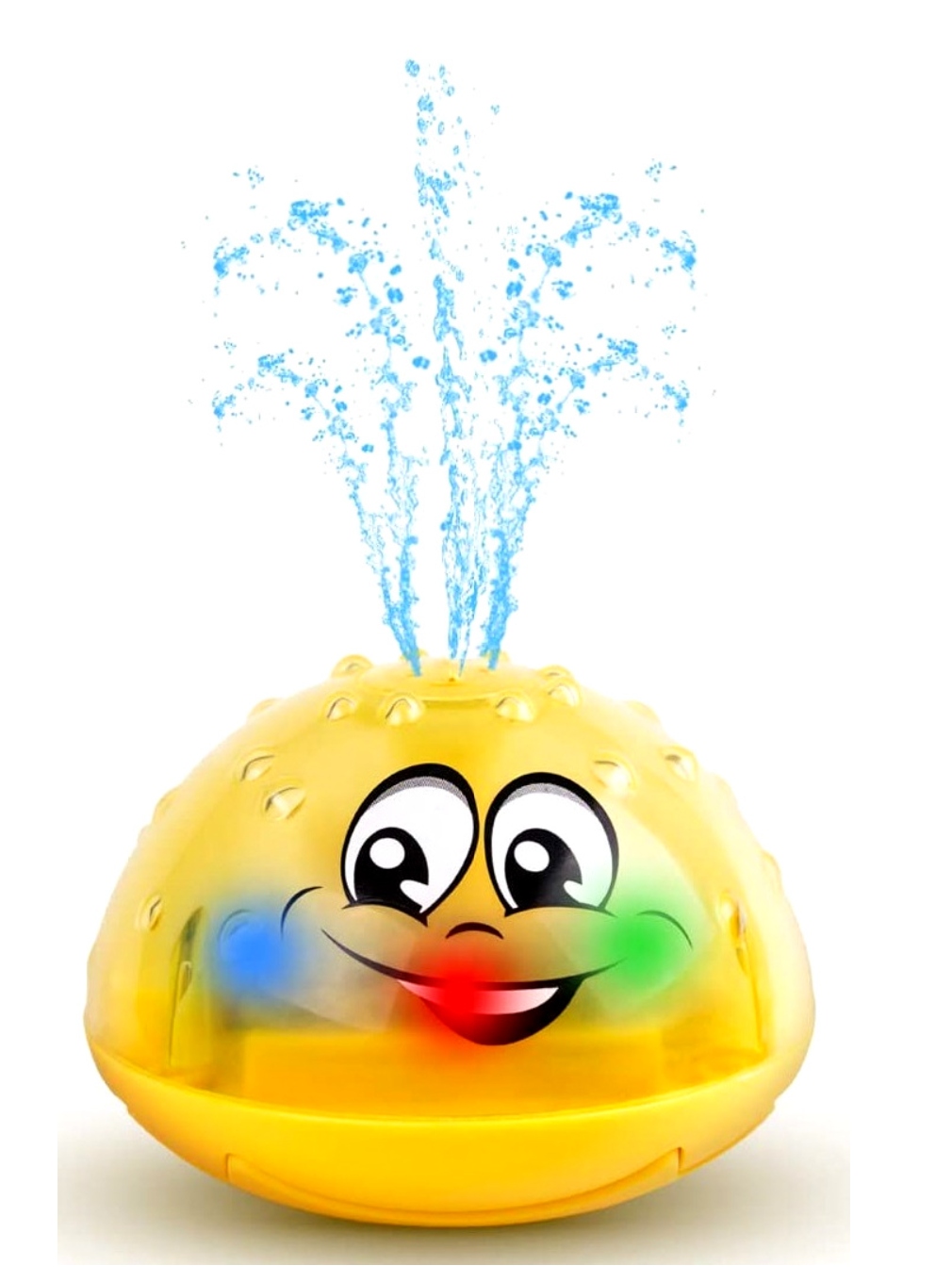 Коли м'яч занурюється у воду, він автоматично активується та створює міні-фонтан. Бризки води супроводжуються різнокольоровими мінливими вогнями. Додатковою привабливістю є виступи на кулі, що імітують краплі води. Нерівна текстура спонукає дитину досліджувати поверхню іграшки маленькими ручками.