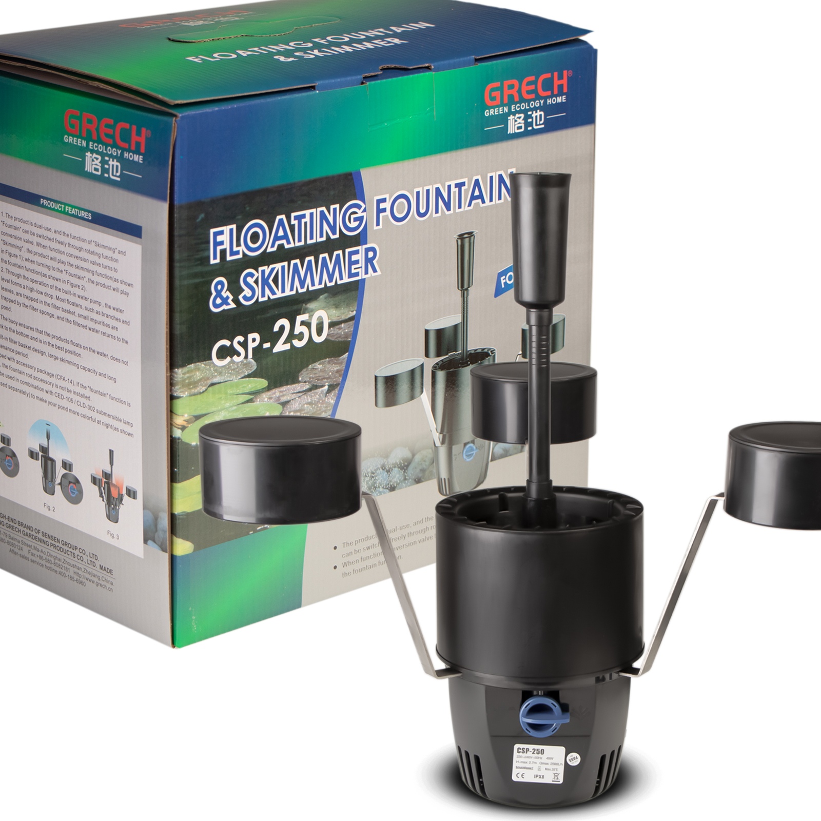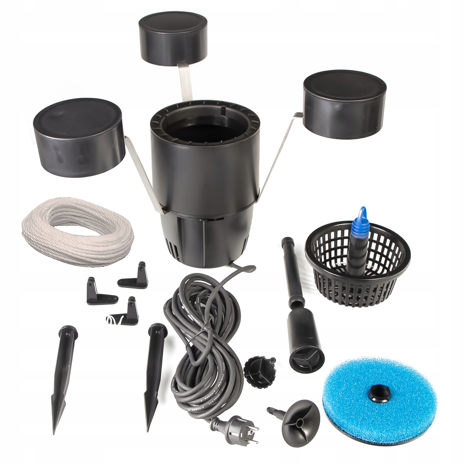 плаваючий поверхневий фільтр з губкою та фонтаном, встановленим в одному. За допомогою цього простого пристрою не тільки ви позбавите забруднення , що плаває на поверхні води, але й ви провітрюєте ставок і додасть йому шарм завдяки фонтану фонтанів з різними кінцями виходу.