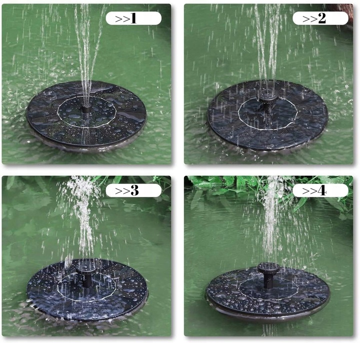 Сонячний садовий фонтан не завжди повинен мати однакові візуальні ефекти! 4 насадки, що входять в комплект, дозволяють змінювати зовнішній вигляд і висоту струменя води. Просто виберіть свій улюблений ефект.
