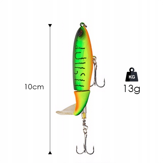 Воблер оснащений обертовим плавником, який створює унікальні вібрації на поверхні води, привабливі для риб. . Крім того, вбудоване брязкальце випромінює високі частоти, привертаючи увагу хижаків навіть на великих відстанях.